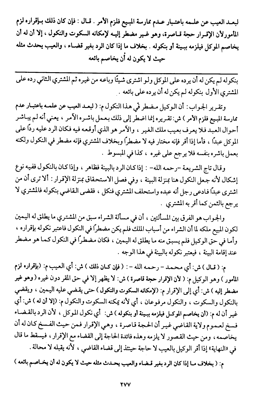 لبعد العيب عن علمه باعتبار عدم ممارسة المبيع فلزم الأمر، قال: فإن كان ذلك بإقراره لزم المأمور لأن الإقرار حجة قاصرة، وهو غير مضطر إليه لإمكانه السكوت والنكول، إلا أن له أن يخاصم الموكل فيلزمه ببينة أو بنكوله. بخلاف ما إذا كان الرد بغير قضاء. والعيب يحدث مثله حيث لا يكون له أن يخاصم بائعه