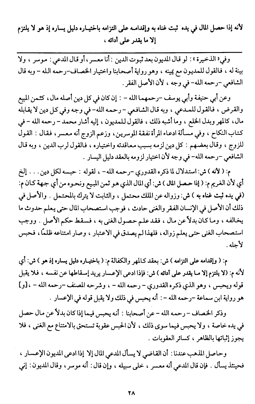 م: (وإقدامه على التزامه) ش: بعقد كالمهر والكفالة م: (باختياره دليل يساره إذ هو) ش: أي لأنه م: (لا يلتزم إلا ما يقدر على أدائه) ش: فإذا ادعى الإعسار يريد إسقاطها عن نفسه، فلا يقبل قوله ويحبس، وهو الذي ذكره القدوري - رَحِمَهُ اللَّهُ -، وشرحه المصنف - رَحِمَهُ اللَّهُ -، [و] هو رواية ابن سماعة - رَحِمَهُ اللَّهُ -: أنه يحبس في ذلك ولا يقبل قوله في الإعسار.