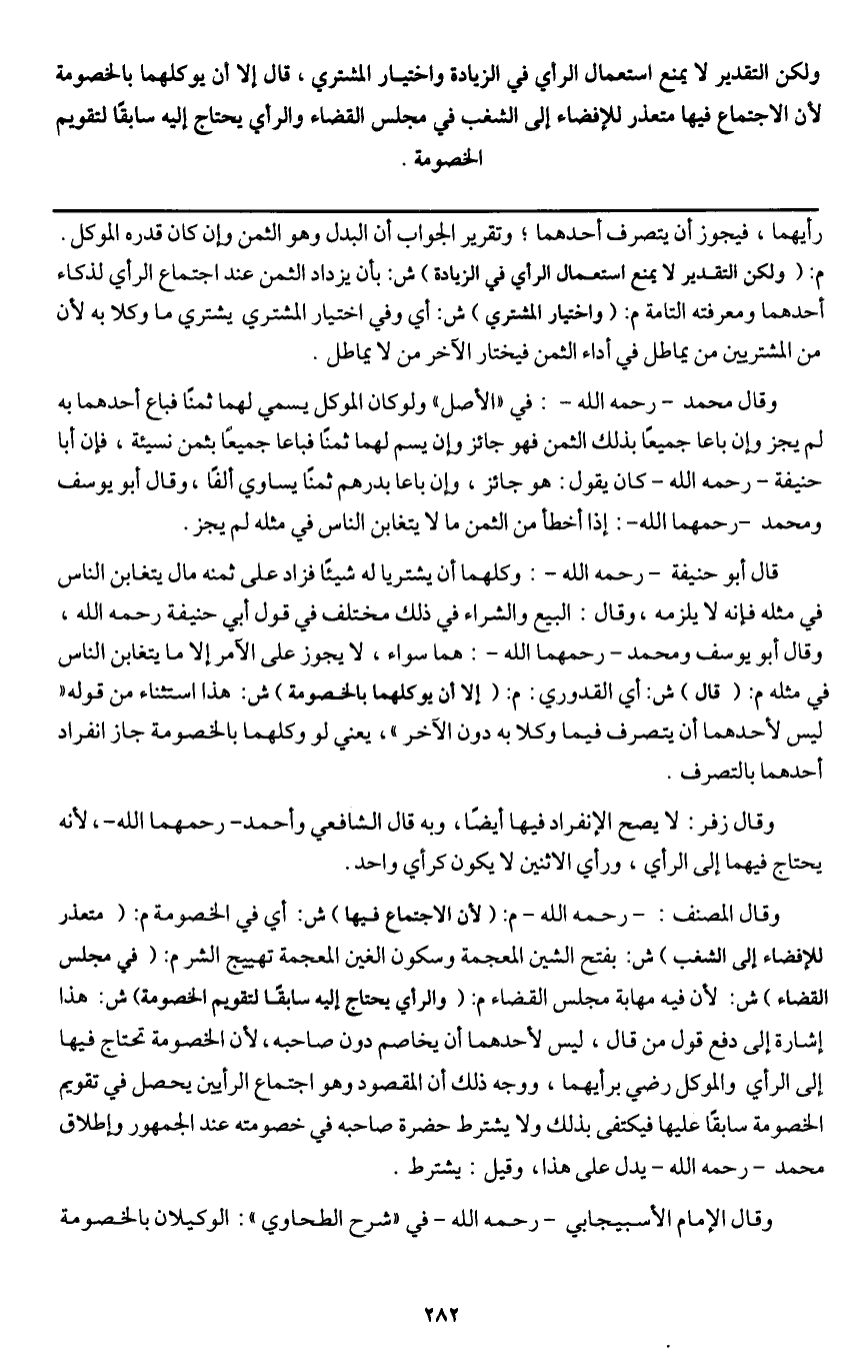وقال الإمام الأسبيجابي - رَحِمَهُ اللَّهُ - في " شرح الطحاوي ": الوكيلان بالخصومة