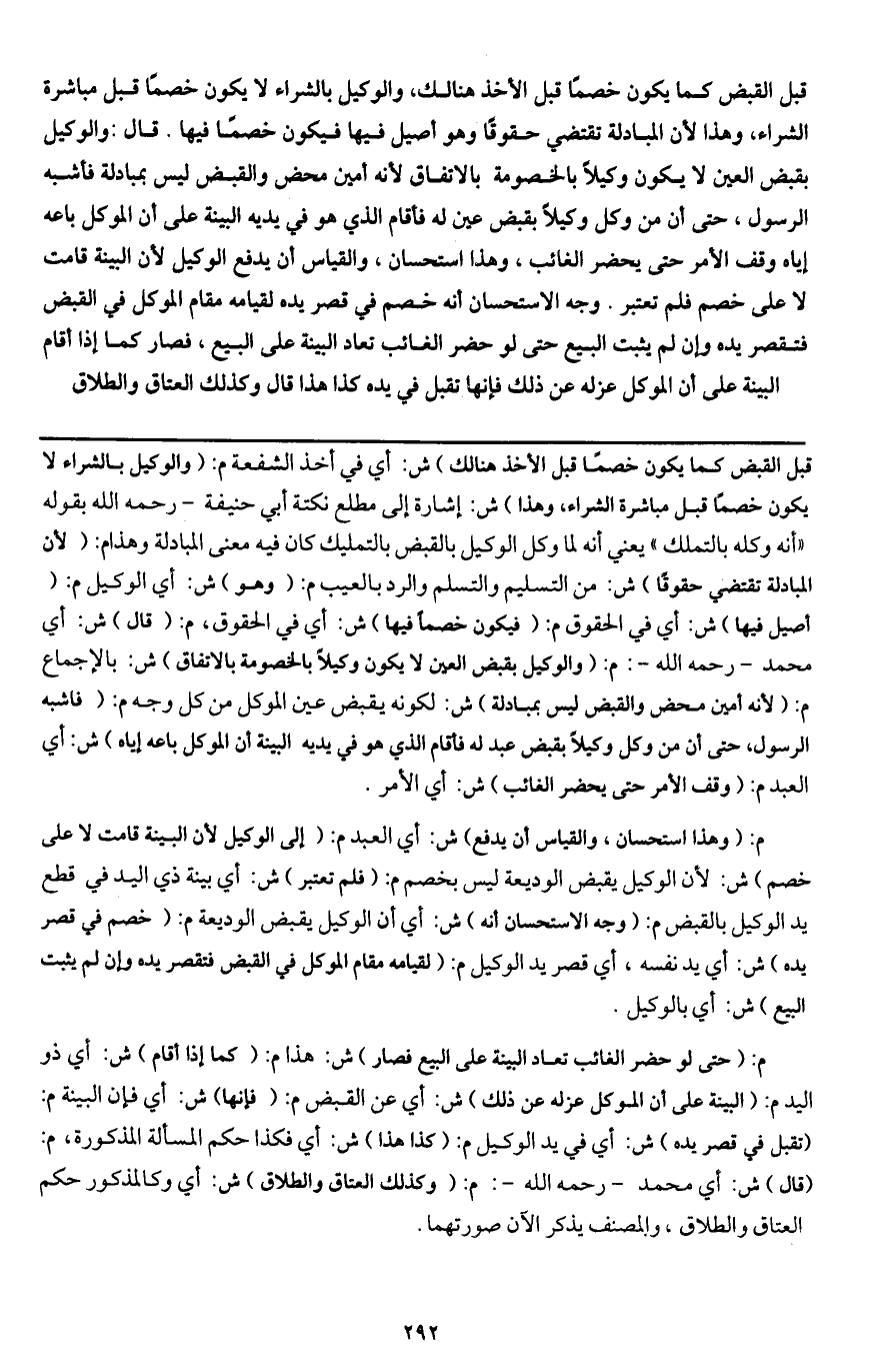قبل القبض كما يكون خصما قبل الأخذ هنالك، والوكيل بالشراء لا يكون خصما قبل مباشرة الشراء، وهذا لأن المبادلة تقتضي حقوقا وهو أصيل فيها فيكون خصما فيها. قال: والوكيل بقبض العين لا يكون وكيلا بالخصومة بالاتفاق لأنه أمين محض والقبض ليس بمبادلة فأشبه الرسول، حتى إن من وكل وكيلا بقبض عين له فأقام الذي هو في يديه البينة على أن الموكل باعه إياه وقف الأمر حتى يحضر الغائب، وهذا استحسان، والقياس أن يدفع الوكيل لأن البينة قامت لا على خصم فلم تعتبر. وجه الاستحسان أنه خصم في قصر يده لقيامه مقام الموكل في القبض فتقصر يده وإن لم يثبت البيع حتى لو حضر الغائب تعاد البينة على البيع، فصار كما إذا أقام البينة على أن الموكل عزله عن ذلك فإنها تقبل في يده كذا هذا قال وكذلك العتاق والطلاق