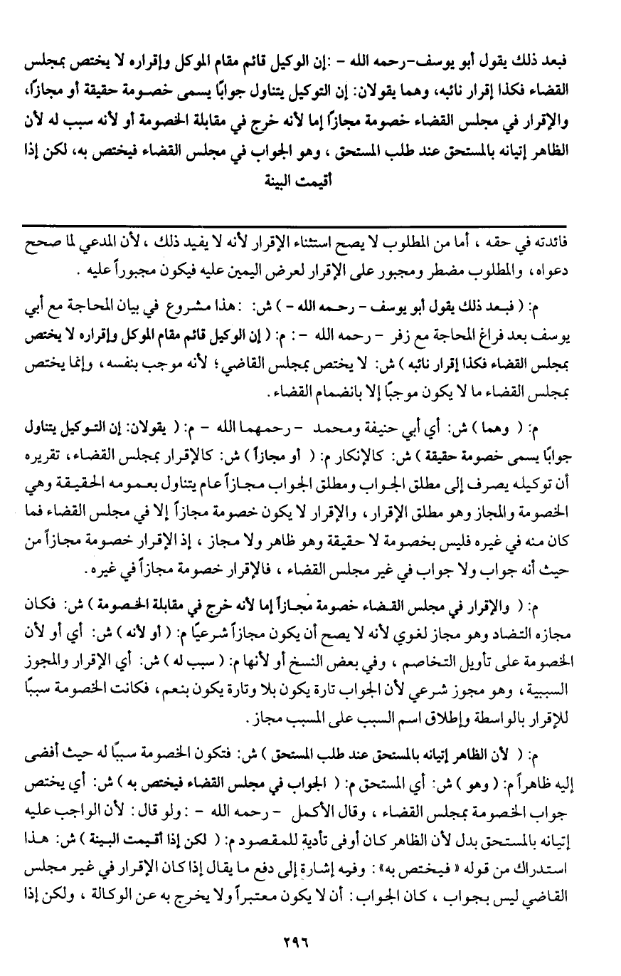 فبعد ذلك يقول أبو يوسف - رَحِمَهُ اللَّهُ -: إن الوكيل قائم مقام الموكل وإقراره لا يختص بمجلس القضاء فكذا إقرار نائبه، وهما يقولان: إن التوكيل يتناول جوابا يسمى خصومة حقيقة أو مجازا، والإقرار في مجلس القضاء خصومة مجازا إما لأنه خرج في مقابلة الخصومة أو لأنه سبب له لأن الظاهر إتيانه بالمستحق عند طلب المستحق، وهو الجواب في مجلس القضاء فيختص به، لكن إذا أقيمت البينة