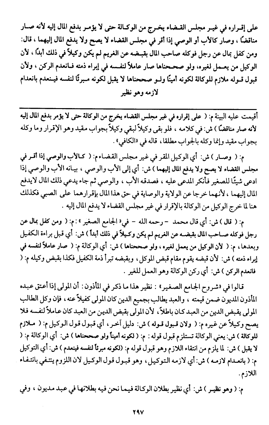ـــــــــــــــــــــــــــــQأقيمت عليه البينة م: (على إقراره في غير مجلس القضاء يخرج من الوكالة حتى لا يؤمر بدفع المال إليه لأنه صار مناقضا) ش: في كلامه، فلو بقي وكيلا لبقي وكيلا بجواب مقيد وهو الإقرار وما وكله بجواب مقيد وإنما وكله بالجواب مطلقا، قاله في " الكافي ".