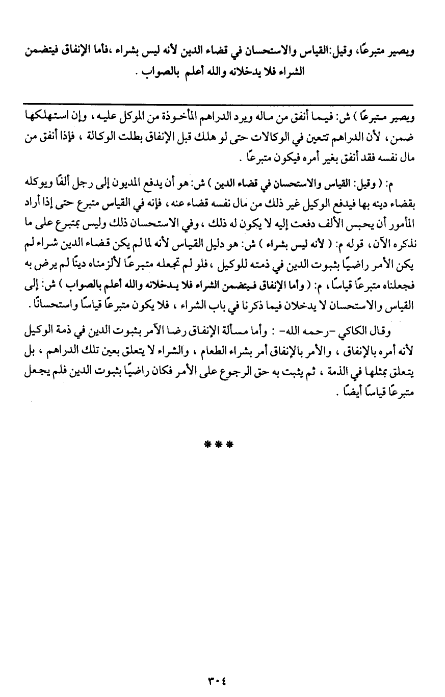 وقال الكاكي - رَحِمَهُ اللَّهُ -: وأما مسألة الإنفاق رضا الآمر بثبوت الدين في ذمة الوكيل لأنه أمره بالإنفاق، والأمر بالإنفاق أمر بشراء الطعام، والشراء لا يتعلق بعين تلك الدراهم، بل يتعلق بمثلها في الذمة، ثم يثبت به حق الرجوع على الأمر فكان راضيا بثبوت الدين فلم يجعل متبرعا قياسا أيضا.