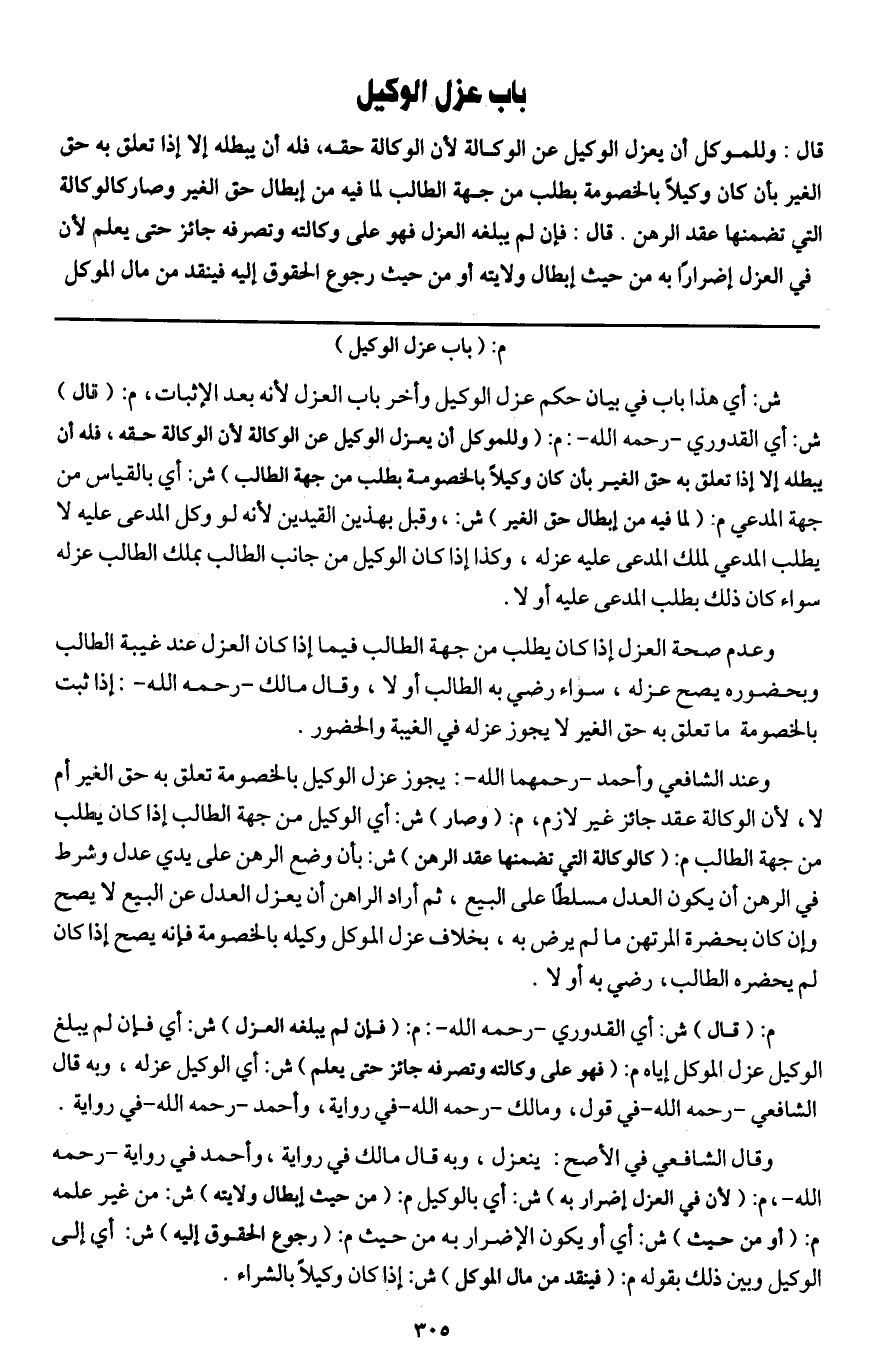 باب عزل الوكيل قال: وللموكل أن يعزل الوكيل عن الوكالة؛ لأن الوكالة حقه، فله أن يبطله إلا إذا تعلق به حق الغير بأن كان وكيلا بالخصومة بطلب من جهة الطالب لما فيه من إبطال حق الغير وصار كالوكالة التي تضمنها عقد الرهن. قال: فإن لم يبلغه العزل فهو على وكالته وتصرفه جائز حتى يعلم؛ لأن في العزل إضرارا به من حيث إبطال ولايته أو من حيث رجوع الحقوق إليه فينقد من مال الموكل