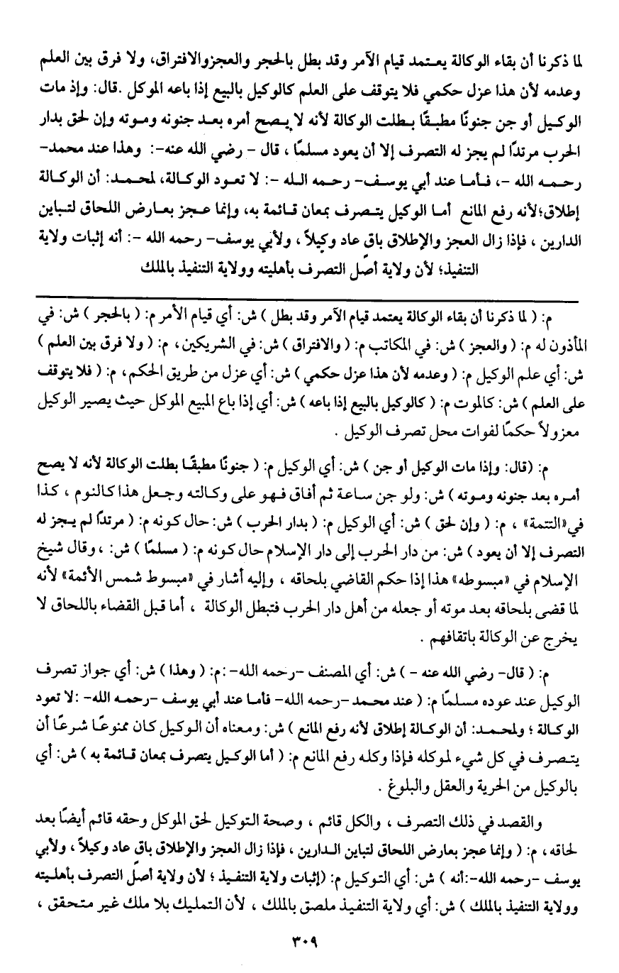 لما ذكرنا أن بقاء الوكالة يعتمد قيام الآمر وقد بطل بالحجر والعجز والافتراق، ولا فرق بين العلم وعدمه لأن هذا عزل حكمي فلا يتوقف على العلم كالوكيل بالبيع إذا باعه الموكل. قال: وإذ مات الوكيل أو جن جنونا مطبقا بطلت الوكالة لأنه لا يصح أمره بعد جنونه وموته وإن لحق بدار الحرب مرتدا لم يجز له التصرف إلا أن يعود مسلما، قال - رَضِيَ اللَّهُ عَنْهُ -: وهذا عند محمد - رَحِمَهُ اللَّهُ -، فأما عند أبي يوسف - رَحِمَهُ اللَّهُ -: لا تعود الوكالة، لمحمد: أن الوكالة إطلاق؛ لأنه رفع المانع أما الوكيل يتصرف بمعان قائمة به، وإنما عجز بعارض اللحاق لتباين الدارين، فإذا زال العجز والإطلاق باق عاد وكيلا، ولأبي يوسف - رَحِمَهُ اللَّهُ -: أنه إثبات ولاية التنفيذ، لأن ولاية أصل التصرف بأهليته وولاية التنفيذ بالملك