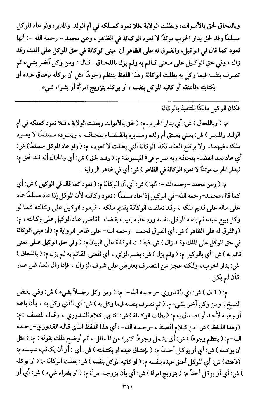وباللحاق لحق بالأموات، وبطلت الولاية، فلا تعود كملكه في أم الولد والمدبر، ولو عاد الموكل مسلما وقد لحق بدار الحرب مرتدا لا تعود الوكالة في الظاهر، وعن محمد - رَحِمَهُ اللَّهُ -: أنها تعود كما قال في الوكيل، والفرق له على الظاهر أن مبنى الوكالة في حق الموكل على الملك وقد زال، وفي حق الوكيل على معنى قائم به ولم يزل باللحاق.