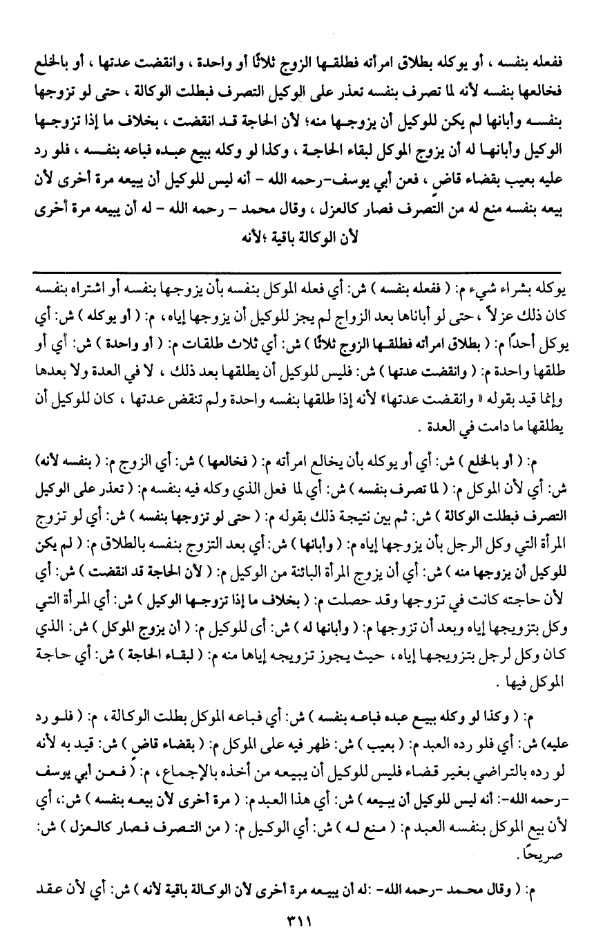 ـــــــــــــــــــــــــــــQيوكله بشراء شيء م: (ففعله بنفسه) ش: أي فعله الموكل بنفسه بأن يزوجها بنفسه أو اشتراه بنفسه كان ذلك عزلا، حتى لو أباناها بعد الزواج لم يجز للوكيل أن يزوجها إياه، م: (أو يوكله) ش: أي يوكل أحدا م: (بطلاق امرأته فطلقها الزوج ثلاثا) ش: أي ثلاث طلقات م: (أو واحدة) ش: أي أو طلقها واحدة م: (وانقضت عدتها) ش: فليس للوكيل أن يطلقها بعد ذلك، لا في العدة ولا بعدها وإنما قيد بقوله " وانقضت عدتها " لأنه إذا طلقها بنفسه واحدة ولم تنقض عدتها، كان للوكيل أن يطلقها ما دامت في العدة.