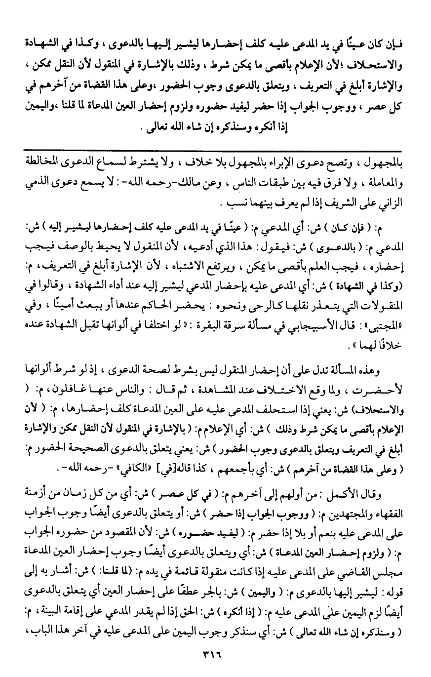 وقال الأكمل: من أولهم إلى آخرهم م: (في كل عصر) ش: أي من كل زمان من أزمنة الفقهاء والمجتهدين م: (ووجوب الجواب إذا حضر) ش: أو يتعلق بالدعوى أيضا وجوب الجواب على المدعى عليه بنعم أو بلا إذا حضر م: (ليفيد حضوره) ش: لأن المقصود من حضوره الجواب م: (ولزوم إحضار العين المدعاة) ش: أي ويتعلق بالدعوى أيضا وجوب إحضار العين المدعاة مجلس القاضي على المدعى عليه إذا كانت منقولة قائمة في يده م: (لما قلنا:) ش: أشار به إلى قوله: ليشير إليها بالدعوى م: (واليمين) ش: بالجر عطفا على إحضار العين أي يتعلق بالدعوى أيضا لزم اليمين على المدعى عليه م: (إذا أنكره) ش: الحق إذا لم يقدر المدعي على إقامة البينة، م: (وسنذكره إن شاء الله تعالى) ش: أي سنذكر وجوب اليمين على المدعى عليه في آخر هذا الباب،