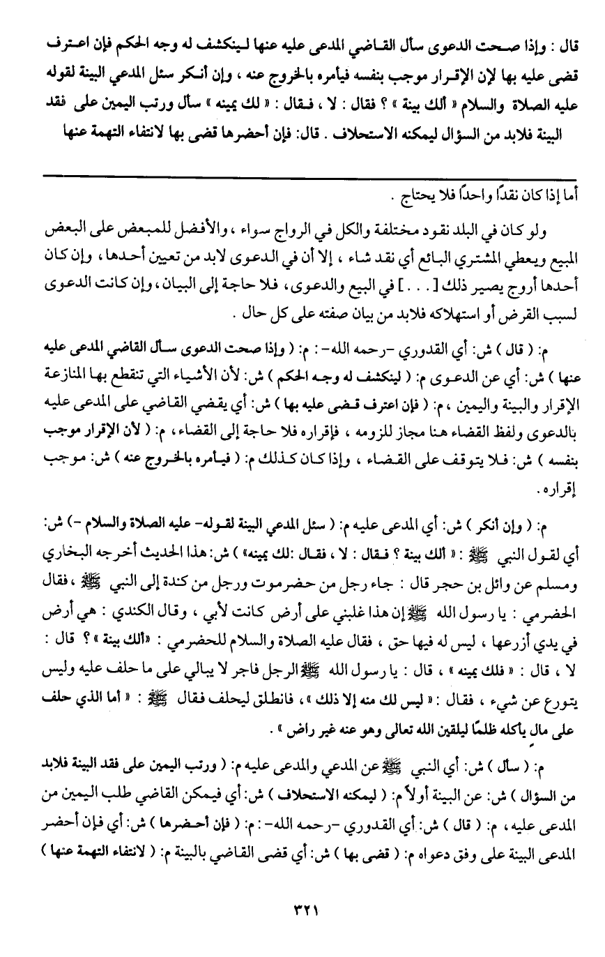 قال: وإذا صحت الدعوى سأل القاضي المدعى عليه عنها لينكشف له وجه الحكم فإن اعترف قضى عليه بها لإن الإقرار موجب بنفسه فيأمره بالخروج عنه، وإن أنكر سئل المدعي البينة لقوله - عَلَيْهِ الصَّلَاةُ وَالسَّلَامُ - «ألك بينة "؟ فقال: لا، فقال: " لك يمينه» سأل ورتب اليمين على فقد البينة فلا بد من السؤال ليمكنه الاستحلاف. قال: فإن أحضرها قضى بها لانتفاء التهمة عنها