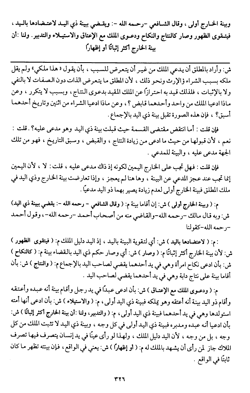 ـــــــــــــــــــــــــــــQش: وأراد بالمطلق أن يدعي الملك من غير أن يتعرض للسبب، بأن يقول "هذا ملكي" ولم يقل ملكه بسبب الشراء والإرث ونحو ذلك، لأن المطلق ما يتعرض الذات دون الصفات لا بالنفي ولا بالإثبات، فلذلك قيد به احترازًا عن الملك المقيد بدعوى النتاج، وبسبب لا يتكرر، وعن ماذا ادعيا الملك من واحد وأحدهما قابض؟، وعن ماذا ادعيا الشراء من اثنين وتارخ أحدهما أسبق؟، فإن هذه الصورة تقبل بينة ذي اليد بالإجماع.