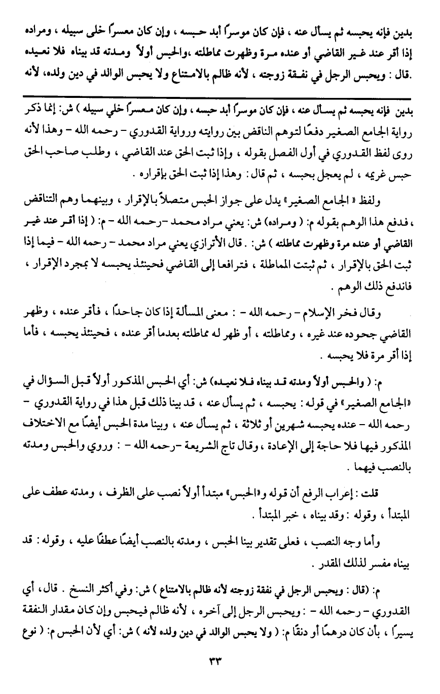 ـــــــــــــــــــــــــــــQبدين فإنه يحبسه ثم يسأل عنه، فإن كان موسرا أبد حبسه، وإن كان معسرا خلى سبيله) ش: إنما ذكر رواية الجامع الصغير دفعا لتوهم التناقض بين روايته ورواية القدوري - رَحِمَهُ اللَّهُ - وهذا لأنه روى لفظ القدوري في أول الفصل بقوله، وإذا ثبت الحق عند القاضي، وطلب صاحب الحق حبس غريمه، لم يعجل بحبسه، ثم قال: وهذا إذا ثبت الحق بإقراره.