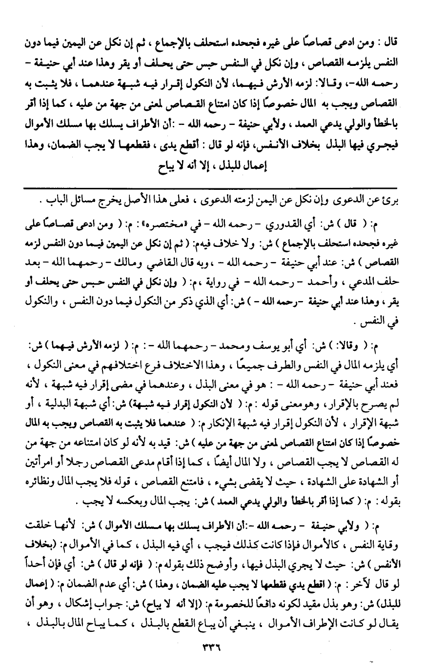 م: (قال) ش: أي القدوري - رَحِمَهُ اللَّهُ - في "مختصره": م: (ومن ادعى قصاصًا على غيره فجحده استحلف بالإجماع) ش: ولا خلاف فيه م: (ثم إن نكل عن اليمين فيما دون النفس لزمه القصاص) ش: عند أبي حنيفة - رَحِمَهُ اللَّهُ -، وبه قال القاضي ومالك - رحمهما الله- بعد حلف المدعي، وأحمد - رَحِمَهُ اللَّهُ - في رواية، م: (وإن نكل في النفس حبس حتى يحلف أو يقر، وهذا عند أبي حنيفة - رَحِمَهُ اللَّهُ -) ش: أي الذي ذكر من النكول فيما دون النفس، والنكول في النفس.
