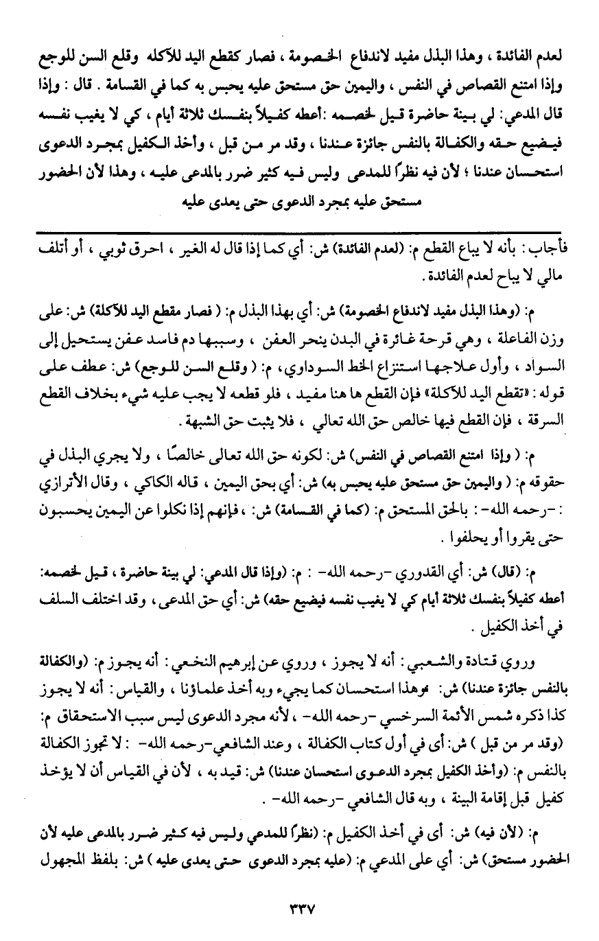 لعدم الفائدة، وهذا البذل مفيد لاندفاع الخصومة، فصار كقطع اليد للآكلة وقلع السن للوجع وإذا امتنع القصاص في النفس، واليمين حق مستحق عليه يحبس به كما في القسامة. قال: وإذا قال المدعي: لي بينة حاضرة قيل لخصمه: أعطه كفيلا بنفسك ثلاثة أيام، كي لا يغيب نفسه فيضيع حقه والكفالة بالنفس جائزة عندنا، وقد مر من قبل، وأخذ الكفيل بمجرد الدعوى استحسان عندنا؛ لأن فيه نظرا للمدعي وليس فيه كثير ضرر بالمدعى عليه، وهذا لأن الحضور مستحق عليه بمجرد الدعوى حتى يعدى عليه