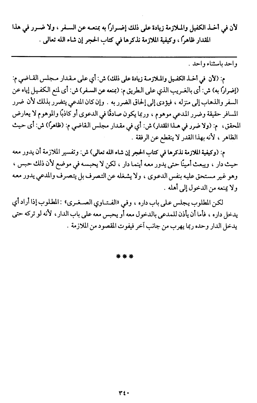 لكن المطلوب يجلس على باب داره، وفي " الفتاوى الصغرى ": المطلوب إذا أراد أن يدخل داره، فإما أن يأذن للمدعي بالدخول معه أو يحبس معه على باب الدار، لأنه لو تركه حتى يدخل الدار وحده ربما يهرب من جانب آخر فيفوت المقصود من الملازمة.