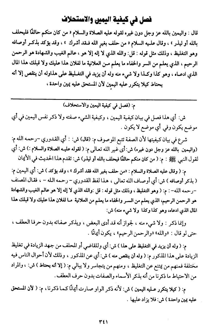 فصل في كيفية اليمين والاستحلاف قال: واليمين بالله عز وجل دون غيره لقوله - عَلَيْهِ الصَّلَاةُ وَالسَّلَامُ - «من كان منكم حالفا فليحلف بالله أو ليذر» ، وقال - عَلَيْهِ السَّلَامُ - «من حلف بغير الله فقد أشرك» ، وقد يؤكد بذكر أوصافه وهو التغليظ، وذلك مثل قوله: قل: والله الذي لا إله إلا هو، عالم الغيب والشهادة هو الرحمن الرحيم، الذي يعلم من السر والخفاء ما يعلم من العلانية ما لفلان هذا عليك ولا قبلك هذا المال الذي ادعاه، وهو كذا وكذا ولا شيء منه وله أن يزيد في التغليظ على هذا وله أن ينقص إلا أنه يحتاط كيلا يتكرر عليه اليمين لأن المستحق عليه يمين واحدة،