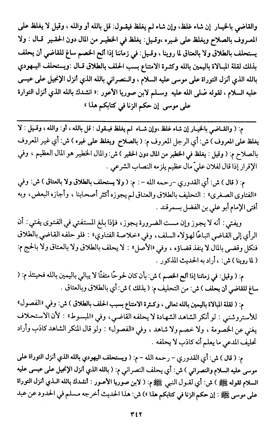 قال: ويستحلف اليهودي بالله الذي أنزل التوراة على موسى - عَلَيْهِ السَّلَامُ -، والنصراني بالله الذي أنزل الإنجيل على عيسى - عَلَيْهِ السَّلَامُ -، «لقوله - صَلَّى اللَّهُ عَلَيْهِ وَسَلَّمَ - لابن صوريا الأعور: "أنشدك بالله الذي أنزل التوراة على موسى إن حكم الزنا في كتابكم هذا»