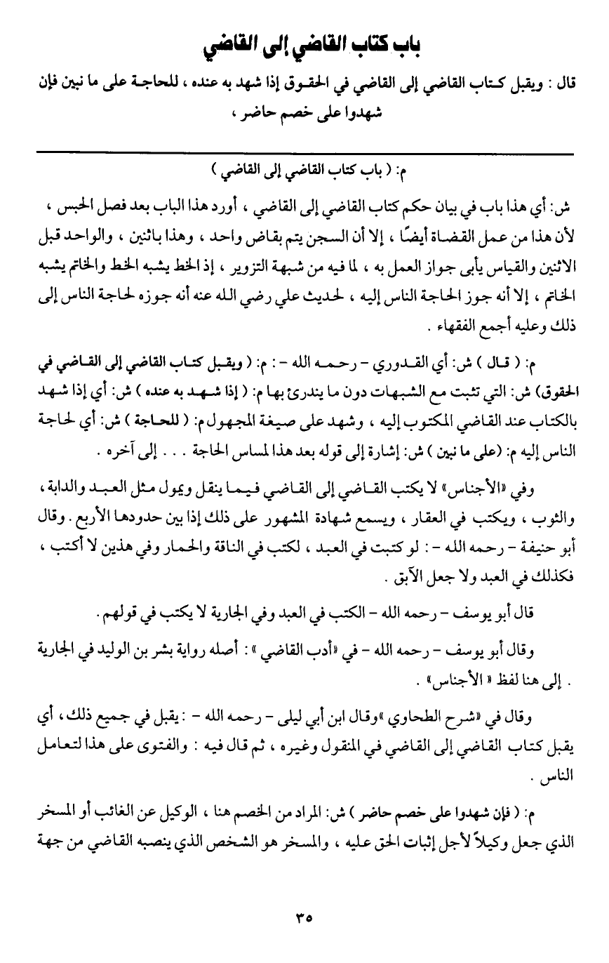 ش: أي هذا باب في بيان حكم كتاب القاضي إلى القاضي، أورد هذا في هذا الكتاب بعد فصل الحبس، لأن هذا من عمل القضاة أيضا، إلا أن السجن يتم بقاض واحد، وهذا باثنين، والواحد قبل الاثنين والقياس يأبى جواز العمل به، لما فيه من شبهة التزوير، إذ الخط يشبه الخط والخاتم يشبه الخاتم، إلا أنه جوز لحاجة الناس إليه، لحديث علي - رَضِيَ اللَّهُ عَنْهُ - أنه جوزه لحاجة الناس إلى ذلك وعليه أجمع الفقهاء.