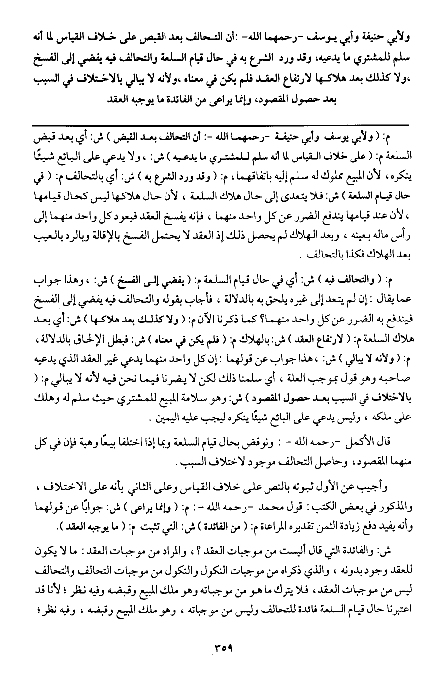 ش: والفائدة التي قال أليست من موجبات العقد؟، والمراد من موجبات العقد: ما لا يكون للعقد وجود بدونه، والذي ذكراه من موجبات النكول والنكول من موجبات التحالف والتحالف ليس من موجبات العقد، فلا يترك ما هو من موجباته وهو ملك المبيع وقبضه وفيه نظر؛ لأنا قد اعتبرنا حال قيام السلعة فائدة للتحالف وليس من موجباته، وهو ملك المبيع وقبضه، وفيه نظر؛