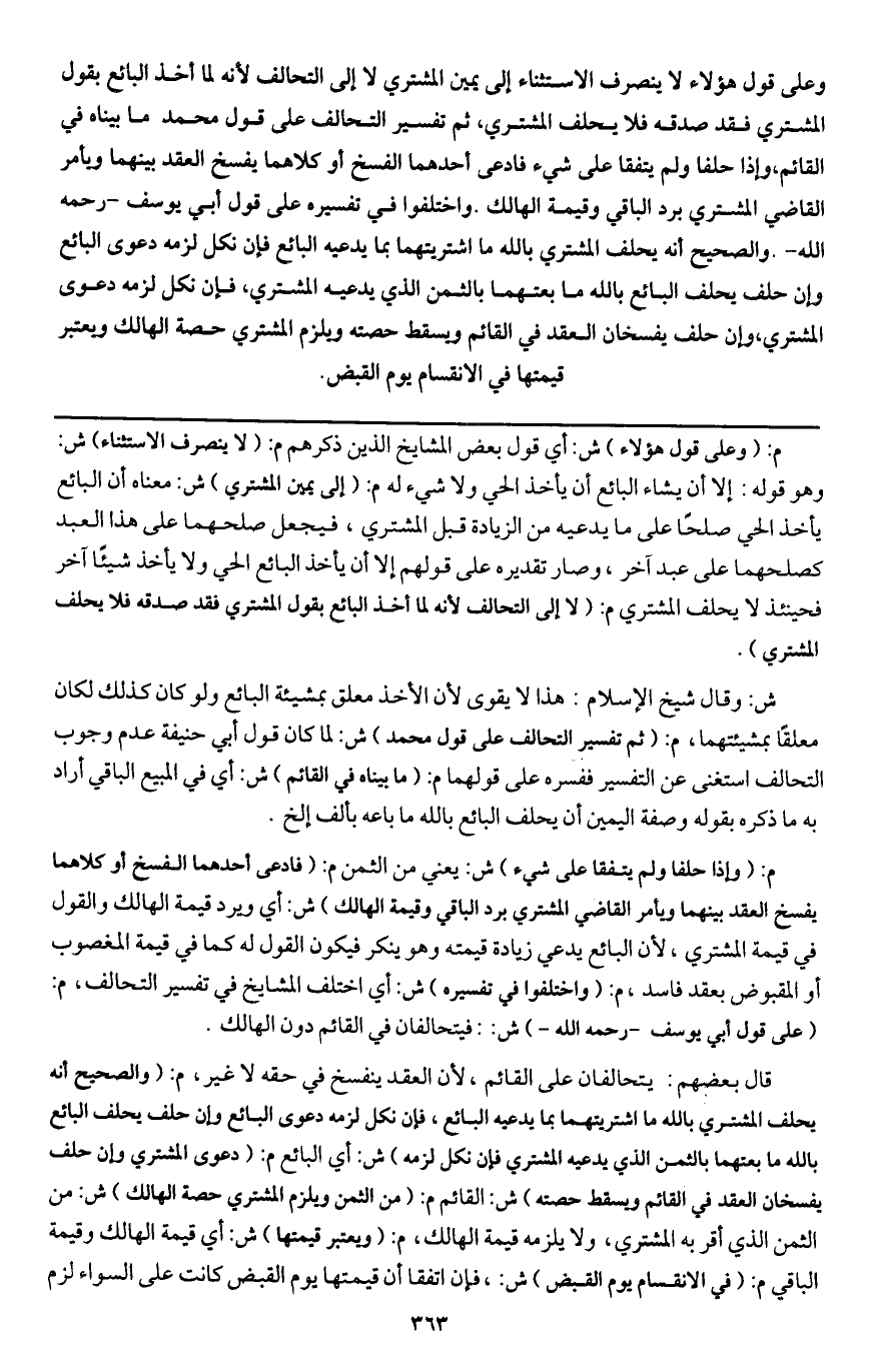 ش: وقال شيخ الإسلام: هذا لا يقوى لأن الأخذ معلق بمشيئة البائع ولو كان كذلك لكان معلقًا بمشيئتهما، م: (ثم تفسير التحالف على قول محمد) ش: لما كان قول أبي حنيفة عدم وجوب التحالف استغنى عن التفسير ففسره على قولهما م: (ما بيناه في القائم) ش: أي في المبيع الباقي أراد به ما ذكره بقوله وصفة اليمين أن يحلف البائع بالله ما باعه بألف إلخ.