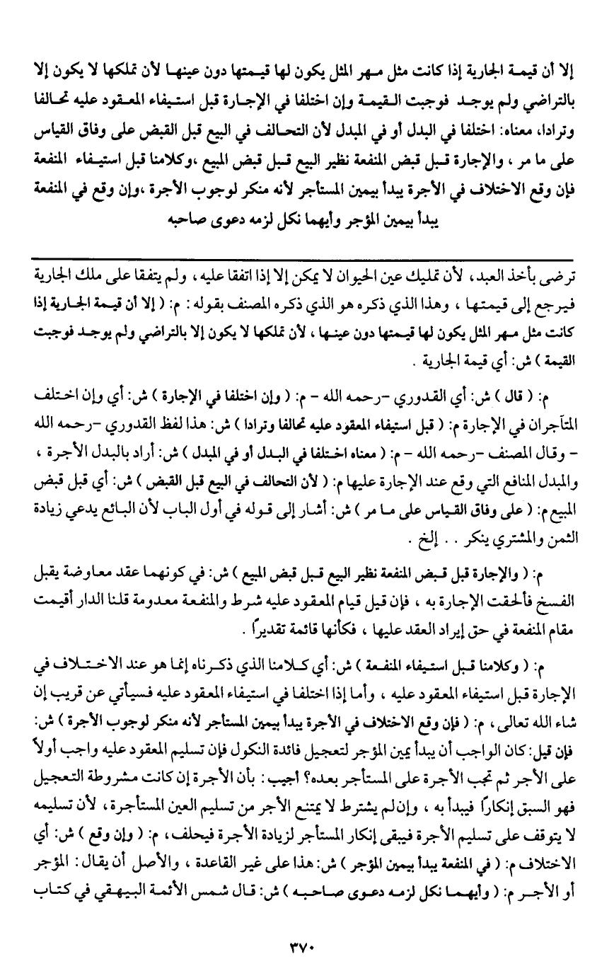 م: (وكلامنا قبل استيفاء المنفعة) ش: أي كلامنا الذي ذكرناه إنما هو عند الاختلاف في الإجارة قبل استيفاء المعقود عليه، وأما إذا اختلفا في استيفاء المعقود عليه فسيأتي عن قريب إن شاء الله تعالى، م: (فإن وقع الاختلاف في الأجرة يبدأ بيمين المستأجر لأنه منكر لوجوب الأجرة) ش: فإن قيل: كان الواجب أن يبدأ بيمين المؤجر لتعجيل فائدة النكول فإن تسليم المعقود عليه واجب أولًا على الأجر ثم تجب الأجرة على المستأجر بعده؟ أجيب: بأن الأجرة إن كانت مشروطة التعجيل فهو السبق إنكارًا فيبدأ به، وإن لم يشترط لا يمتنع الأجر من تسليم العين المستأجرة، لأن تسليمه لا يتوقف على تسليم الأجرة فيبقى إنكار المستأجر لزيادة الأجرة فيحلف، م: (وإن وقع) ش: أي الاختلاف م: (في المنفعة يبدأ بيمين المؤجر) ش: هذا على غير القاعدة، والأصل أن يقال: المؤجر أو الأجير م: (وأيهما نكل لزمه دعوى صاحبه) ش: قال شمس الأئمة البيهقي في كتاب