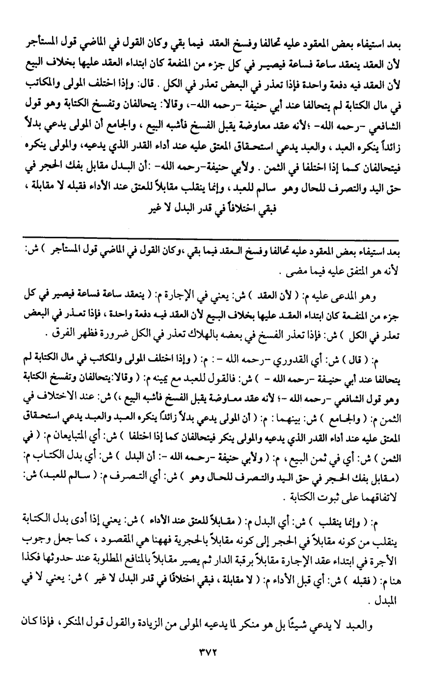 بعد استيفاء بعض المعقود عليه تحالفا وفسخ العقد فيما بقي وكان القول في الماضي قول المستأجر لأن العقد ينعقد ساعة فساعة فيصير في كل جزء من المنفعة كان ابتداء العقد عليها بخلاف البيع؛ لأن العقد فيه دفعة واحدة فإذا تعذر في البعض تعذر في الكل. قال: وإذا اختلف المولى والمكاتب في مال الكتابة لم يتحالفا عند أبي حنيفة - رَحِمَهُ اللَّهُ -، وقالا: يتحالفان وتفسخ الكتابة وهو قول الشافعي - رَحِمَهُ اللَّهُ -؛ لأنه عقد معاوضة يقبل الفسخ فأشبه البيع، والجامع أن المولى يدعي بدلا زائدا ينكره العبد، والعبد يدعي استحقاق المعتق عليه عند أداء القدر الذي يدعيه، والمولى ينكره فيتحالفان كما إذا اختلفا في الثمن. ولأبي حنيفة - رَحِمَهُ اللَّهُ -: أن البدل مقابل بفك الحجر في حق اليد والتصرف للحال وهو سالم للعبد، وإنما ينقلب مقابلا للعتق عند الأداء فقبله لا مقابلة، فبقي اختلافا في قدر البدل لا غير