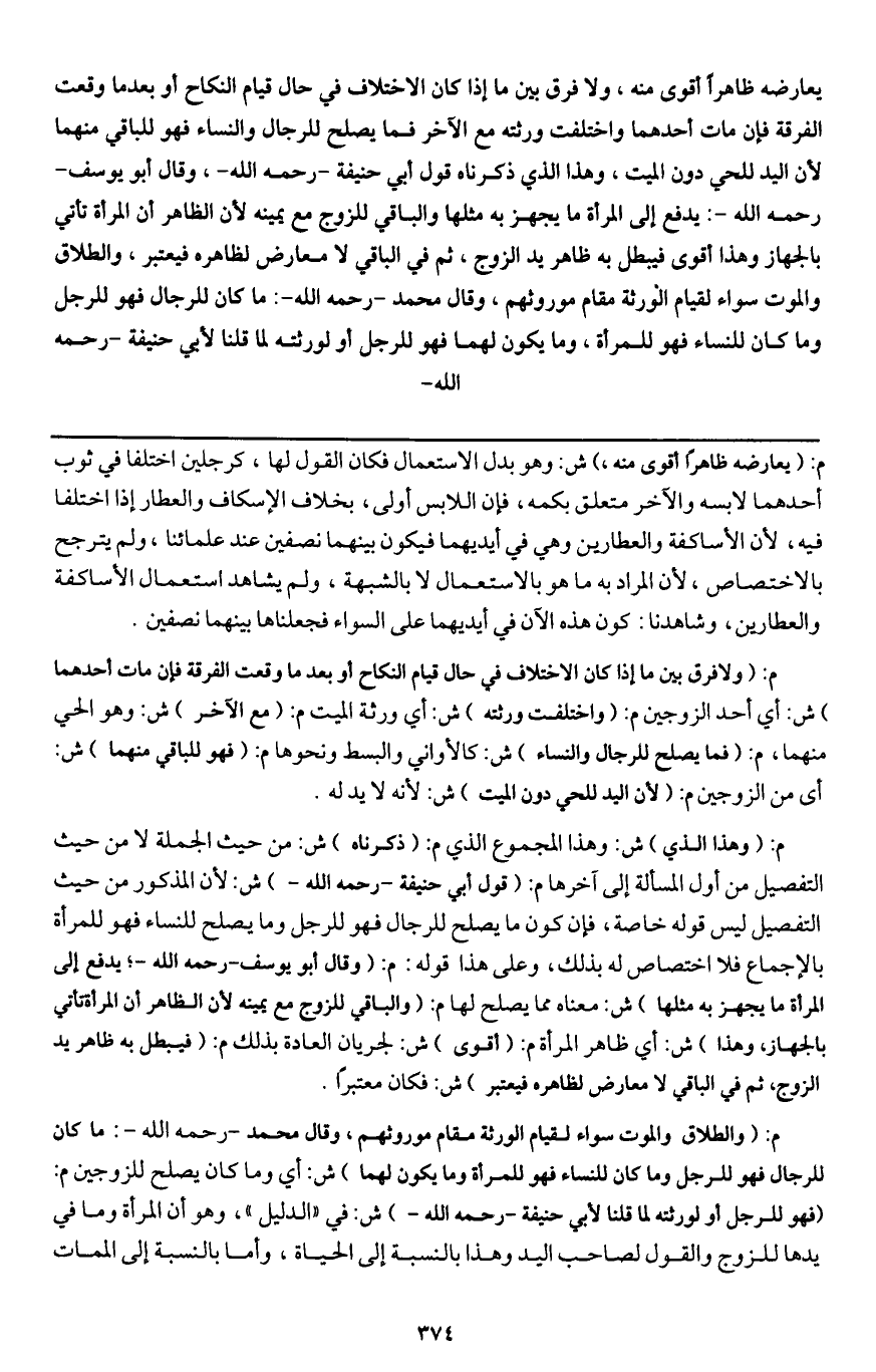 يعارضه ظاهرا أقوى منه، ولا فرق بين ما إذا كان الاختلاف في حال قيام النكاح أو بعدما وقعت الفرقة فإن مات أحدهما واختلفت ورثته مع الآخر فما يصلح للرجال والنساء فهو للباقي منهما لأن اليد للحي دون الميت، وهذا الذي ذكرناه قول أبي حنيفة - رَحِمَهُ اللَّهُ -، وقال أبو يوسف - رَحِمَهُ اللَّهُ -: يدفع إلى المرأة ما يجهز به مثلها والباقي للزوج مع يمينه لأن الظاهر أن المرأة تأتي بالجهاز وهذا أقوى فيبطل به ظاهر يد الزوج، ثم في الباقي لا معارض لظاهره فيعتبر، والطلاق والموت سواء لقيام الورثة مقام موروثهم، وقال محمد - رَحِمَهُ اللَّهُ -: ما كان للرجال فهو للرجل وما كان للنساء فهو للمرأة، وما يكون لهما فهو للرجل أو لورثته لما قلنا لأبي حنيفة - رَحِمَهُ اللَّهُ -
