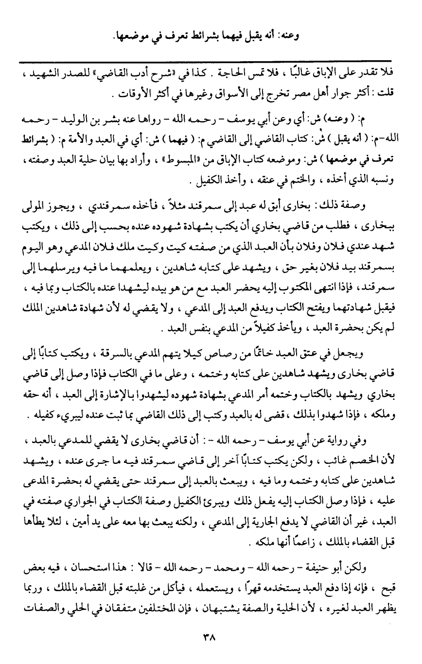 م: (وعنه) ش: أي وعن أبي يوسف - رَحِمَهُ اللَّهُ - رواها عنه بشر بن الوليد - رَحِمَهُ اللَّهُ - م: (أنه يقبل) ش: كتاب القاضي إلى القاضي م: (فيهما) ش: أي في العبد والأمة م: (بشرائط تعرف في موضعها) ش: وموضعه كتاب الإباق من " المبسوط "، وأراد بها بيان حلية العبد وصفته، ونسبه الذي أخذه، والختم في عنقه، وأخذ الكفيل.