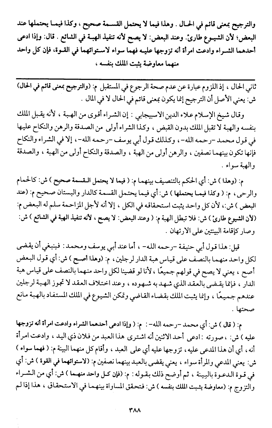 والترجيح بمعنى قائم في الحال. وهذا فيما لا يحتمل القسمة صحيح، وكذا فيما يحتملها عند البعض؛ لأن الشيوع طارئ. وعند البعض: لا يصح لأنه تنفيذ الهبة في الشائع.