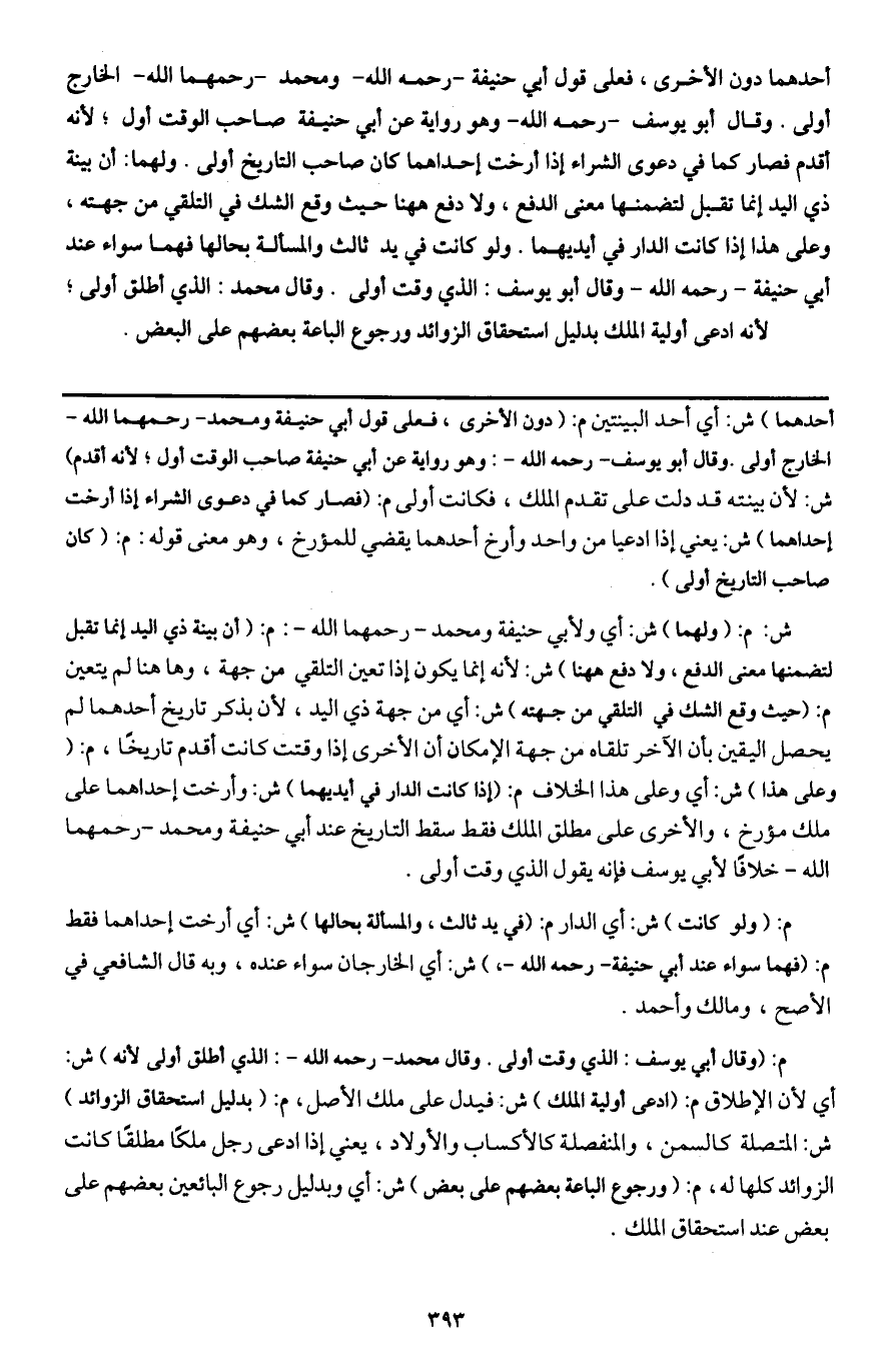 م: (وقال أبي يوسف: الذي وقت أولى. وقال محمد - رَحِمَهُ اللَّهُ -: الذي أطلق أولى لأنه) ش: أي لأن الإطلاق م: (ادعى أولية الملك) ش: فيدل على ملك الأصل، م: (بدليل استحقاق الزوائد) ش: المتصلة كالسمن، والمنفصلة كالأكساب والأولاد، يعني إذا ادعى رجل ملكاً مطلقاً كانت الزوائد كلها له، م: (ورجوع الباعة بعضهم على بعض) ش: أي وبدليل رجوع البائعين بعضهم على بعض عند استحقاق الملك.