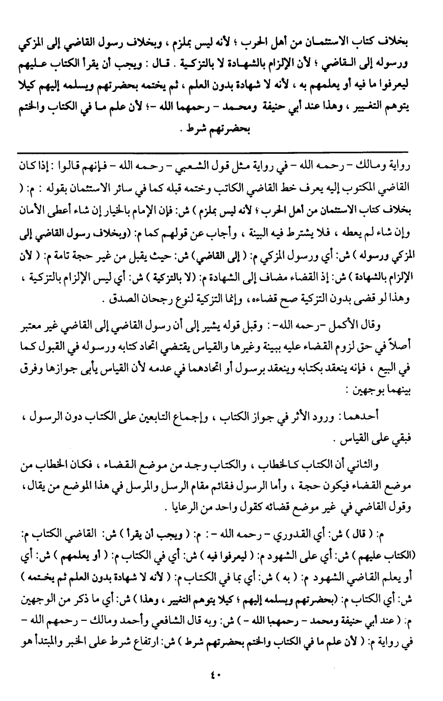 بخلاف كتاب الاستئمان من أهل الحرب؛ لأنه ليس بملزم، وبخلاف رسول القاضي إلى المزكي ورسوله إلى القاضي؛ لأن الإلزام بالشهادة لا بالتزكية. قال: ويجب أن يقرأ الكتاب عليهم؛ ليعرفوا ما فيه أو يعلمهم به، لأنه لا شهادة بدون العلم، ثم يختمه بحضرتهم ويسلمه إليهم كيلا يتوهم التغيير، وهذا عند أبي حنيفة ومحمد - رحمهما الله -؛ لأن علم ما في الكتاب والختم بحضرتهم شرط.