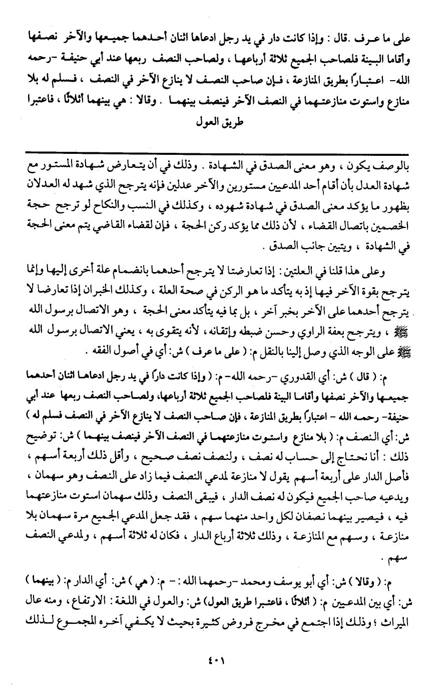 م: (وقالا) ش: أي أبو يوسف ومحمد - رحمهما الله: - م: (هي) ش: أي الدار م: (بينهما) ش: أي بين المدعيين م: (أثلاثا، فاعتبرا طريق العول) ش: والعول في اللغة: الارتفاع، ومنه عال الميراث؛ وذلك إذا اجتمع في مخرج فروض كثيرة بحيث لا يكفي آخره المجموع لذلك