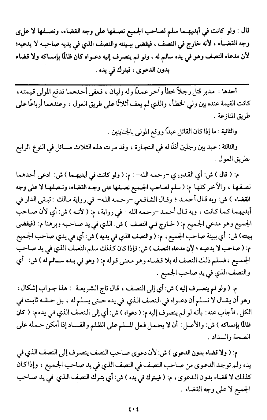 م: (قال) ش: أي القدوري - رَحِمَهُ اللَّهُ -: م: (ولو كانت في أيديهما) ش: ادعى أحدهما نصفها، والآخر كلها م: (سلم لصاحب الجميع نصفها على وجه القضاء، ونصفها لا على وجه القضاء) ش: وبه قال أحمد؛ وقال الشافعي - رَحِمَهُ اللَّهُ - في رواية مالك: تبقى الدار في أيديهما كما كانت، وبه قال أحمد - رَحِمَهُ اللَّهُ - في رواية، م: (لأنه) ش: أي لأن صاحب الجميع وهو مدعي الجميع م: (خارج في النصف) ش: الذي في يد صاحبه وبرهنا م: (فيقضى ببينته) ش: أي ببينة صاحب الجميع، م: (والنصف الذي بين يديه) ش: أي في يدي صاحب الجميع م: (صاحب لا يدعيه؛ لأن مدعاه النصف) ش: فإذا كان كذلك سلم النصف الذي في يد صاحب الجميع، فسلم ذلك النصف له بلا قضاء وهو معنى قوله م: (وهو في يده سالم له) ش: أي والنصف الذي في يد صاحب الجميع.