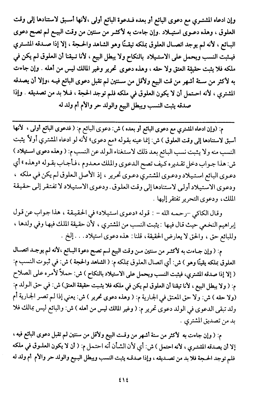 وإن ادعاه المشتري مع دعوى البائع أو بعده فدعوة البائع أولى، لأنها أسبق لاستنادها إلى وقت العلوق، وهذه دعوى استيلاد. وإن جاءت به لأكثر من سنتين من وقت البيع لم تصح دعوى البائع، لأنه لم يوجد اتصال العلوق بملكه تيقنا وهو الشاهد والحجة، إلا إذا صدقه المشتري فيثبت النسب ويحمل على الاستيلاد بالنكاح ولا يبطل البيع، لأنا تيقنا أن العلوق لم يكن في ملكه فلا يثبت حقيقة العتق ولا حقه، وهذه دعوى تحرير وغير المالك ليس من أهله. وإن جاءت به لأكثر من ستة أشهر من وقت البيع ولأقل من سنتين لم تقبل دعوى البائع فيه، وإلا أن يصدقه المشتري، لأنه احتمل أن لا يكون العلوق في ملكه فلم توجد الحجة، فلا بد من تصديقه. وإذا صدقه يثبت النسب ويبطل البيع والولد حر والأم أم ولد له