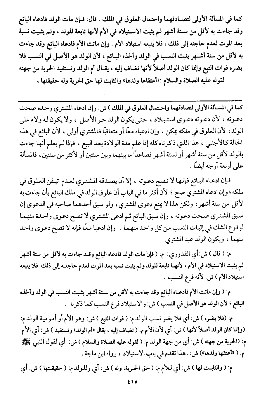 ـــــــــــــــــــــــــــــQكما في المسألة الأولى لتصادقهما واحتمال العلوق في الملك) ش: وإن ادعاه المشتري وحده صحت دعوته، لأن دعوته دعوى استيلاد، حتى يكون الولد حر الأصل، ولا يكون له ولاء على الولد، لأن العلوق في ملكه يمكن، وإن ادعياه معاً أو متعاقباً فالمشتري أولى، لأن البائع في هذه الحالة كالأجنبي، هذا الذي ذكرناه كله إذا علم مدة الولادة بعد البيع، فإذا لم يعلم أنها جاءت بالولد لأقل من ستة أشهر فصاعداً ما بينهما وبين سنتين أو لأكثر من سنتين، فالمسألة على أربعة أوجه أيضاً.