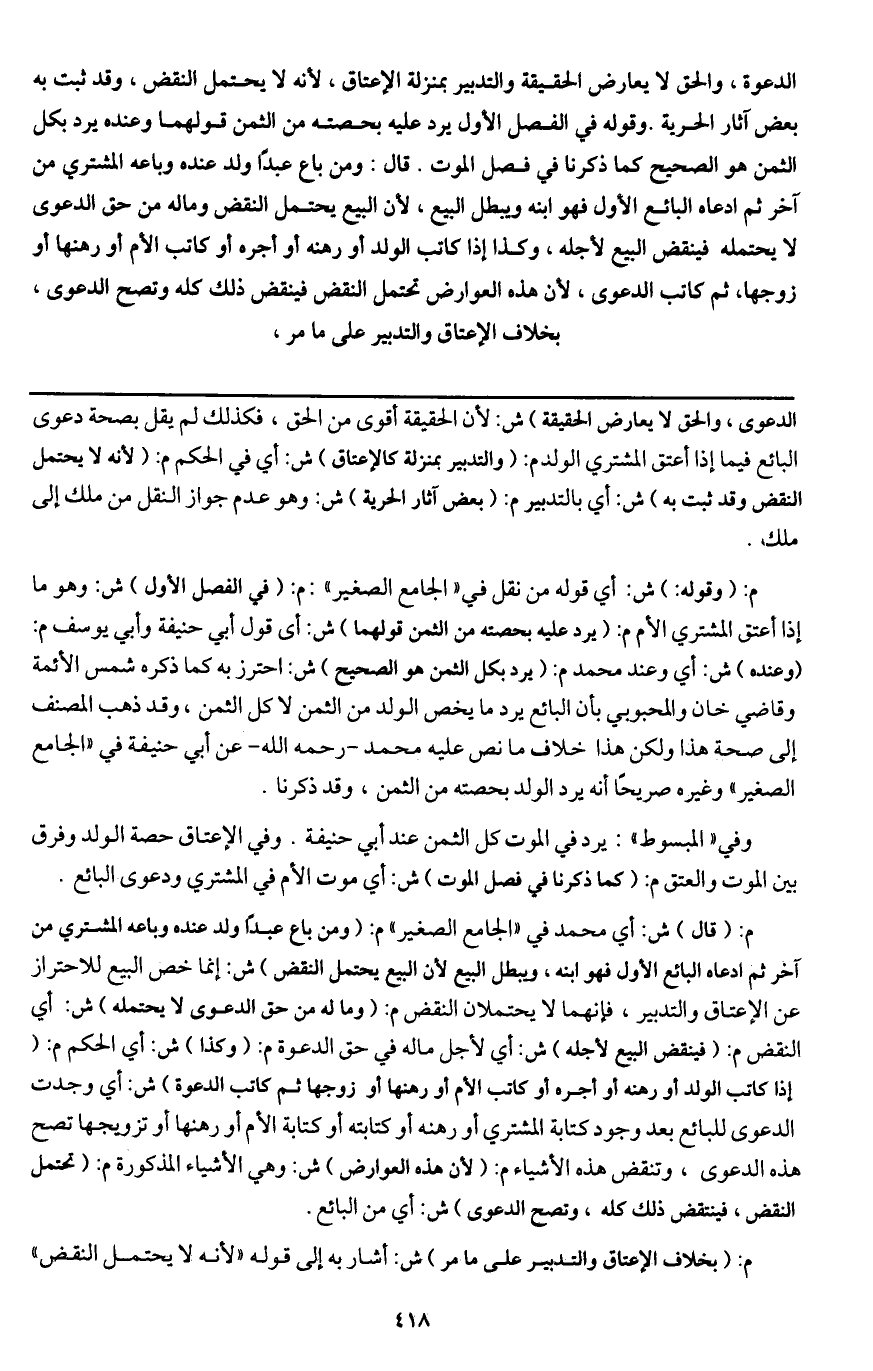 الدعوة، والحق لا يعارض الحقيقة والتدبير بمنزلة الإعتاق، لأنه لا يحتمل النقض، وقد ثبت به بعض آثار الحرية. وقوله في الفصل الأول يرد عليه بحصته من الثمن قولهما وعنده يرد بكل الثمن وهو الصحيح كما ذكرنا في فصل الموت.