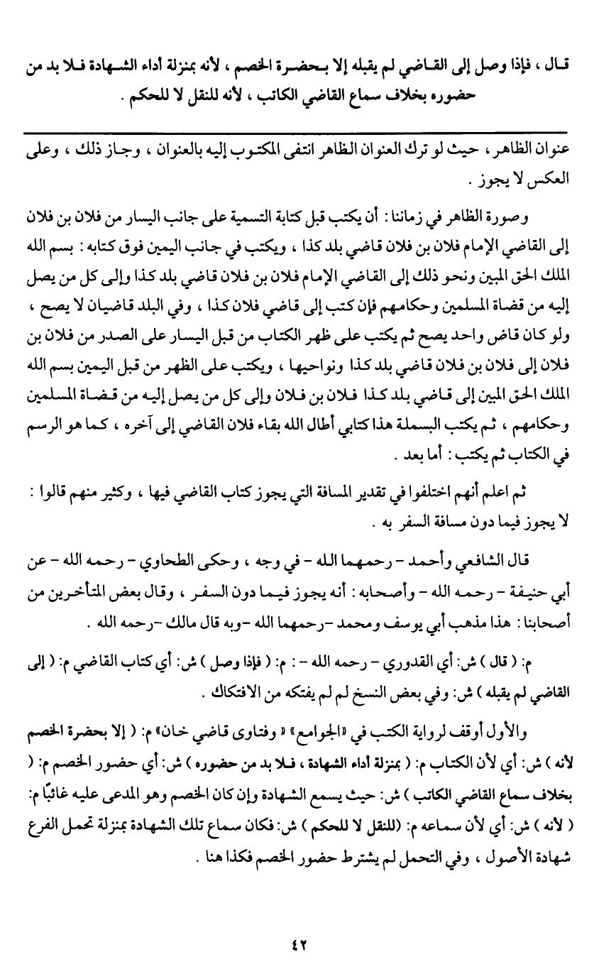 وصورة الظاهر في زماننا: أن يكتب قبل كتابة التسمية على جانب اليسار من فلان بن فلان إلى القاضي الإمام فلان بن فلان قاضي بلد كذا، ويكتب في جانب اليمين فوق كتابه: بسم الله الحق المبين ونحو ذلك إلى القاضي الإمام فلان بن فلان قاضي بلد كذا، وإلى كل من يصل إليه من قضاة المسلمين وحكامهم فإن كتب إلى قاضي فلان كذا، وفي البلد قاضيان لا يصح، ولو كان قاض واحد يصح ثم يكتب على ظهر الكتاب من قبل اليسار على الصدر من فلان بن فلان إلى فلان بن فلان قاضي بلد كذا ونواحيها، ويكتب على الظهر من قبل اليمين بسم الله الملك الحق المبين إلى قاضي بلد كذا فلان بن فلان وإلى كل من يصل إليه من قضاة المسلمين وحكامهم، ثم يكتب البسملة هذا كتابي أطال الله بقاء فلان القاضي إلى آخره، كما هو الرسم في الكتاب ثم يكتب: أما بعد.