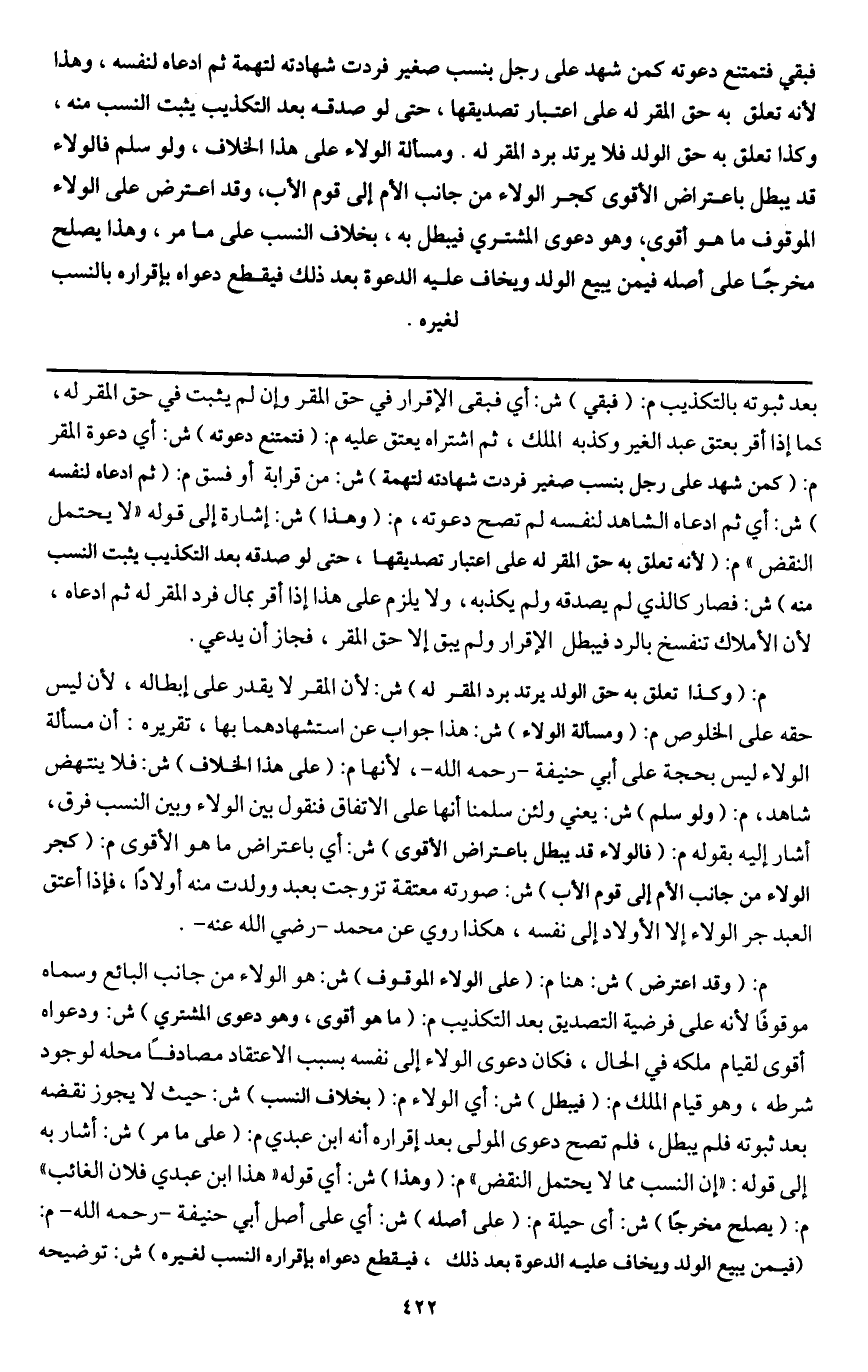 ـــــــــــــــــــــــــــــQبعد ثبوته بالتكذيب م: (فبقي) ش: أي فبقي الإقرار في حق المقر وإن لم يثبت في حق المقر له، كما إذا أقر بعتق عبد الغير وكذبه الملك، ثم اشتراه يعتق عليه م: (فتمتنع دعوته) ش: أي دعوة المقر م: (كمن شهد على رجل بنسب صغير فردت شهادته لتهمة) ش: من قرابة أو فسق م: (ثم ادعاه لنفسه) ش: أي ثم ادعاه الشاهد لنفسه لم تصح دعوته، م: (وهذا) ش: إشارة إلى قوله " لا يحتمل النقض " م: (لأنه تعلق به حق المقر له على اعتبار تصديقها، حتى لو صدقه بعد التكذيب يثبت النسب منه) ش: فصار كالذي لم يصدقه ولم يكذبه، ولا يلزم على هذا إذا أقر بمال فرد المقر له ثم ادعاه، لأن الأملاك تنفسخ بالرد فيبطل الإقرار ولم يبق إلا حق المقر، فجاز أن يدعي.