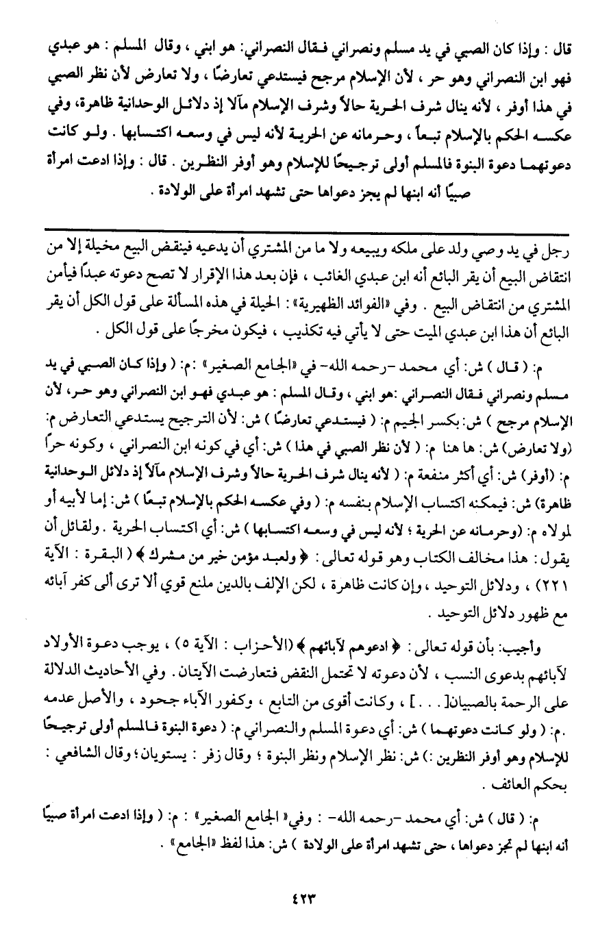 م: (قال) ش: أي محمد - رَحِمَهُ اللَّهُ - في " الجامع الصغير ": م: (وإذا كان الصبي في يد مسلم ونصراني فقال النصراني: هو ابني، وقال المسلم: هو عبدي فهو ابن النصراني وهو حر، لأن الإسلام مرجح) ش: بكسر الجيم م: (فيستدعي تعارضاً) ش: لأن الترجيح يستدعي التعارض م: (ولا تعارض) ش: ها هنا م: (لأن نظر الصبي في هذا) ش: أي في كونه ابن النصراني، وكونه حراً م: (أوفر) ش: أي أكثر منفعة م: (لأنه ينال شرف الحرية حالاً وشرف الإسلام مآلا إذ دلائل الوحدانية ظاهرة) ش: فيمكنه اكتساب الإسلام بنفسه م: (وفي عكسه الحكم بالإسلام تبعاً) ش: إما لأبيه أو لمولاه م: (وحرمانه عن الحرية؛ لأنه ليس في وسعه اكتسابها) ش: أي اكتساب الحرية. ولقائل أن يقول: هذا مخالف الكتاب وهو قَوْله تَعَالَى {وَلَعَبْدٌ مُؤْمِنٌ خَيْرٌ مِنْ مُشْرِكٍ} [البقرة: 221] (البقرة: الآية 221) ، ودلائل التوحيد، وإن كانت ظاهرة، لكن الإلف بالدين مانع قوي ألا ترى إلى كفر آبائه مع ظهور دلائل التوحيد.