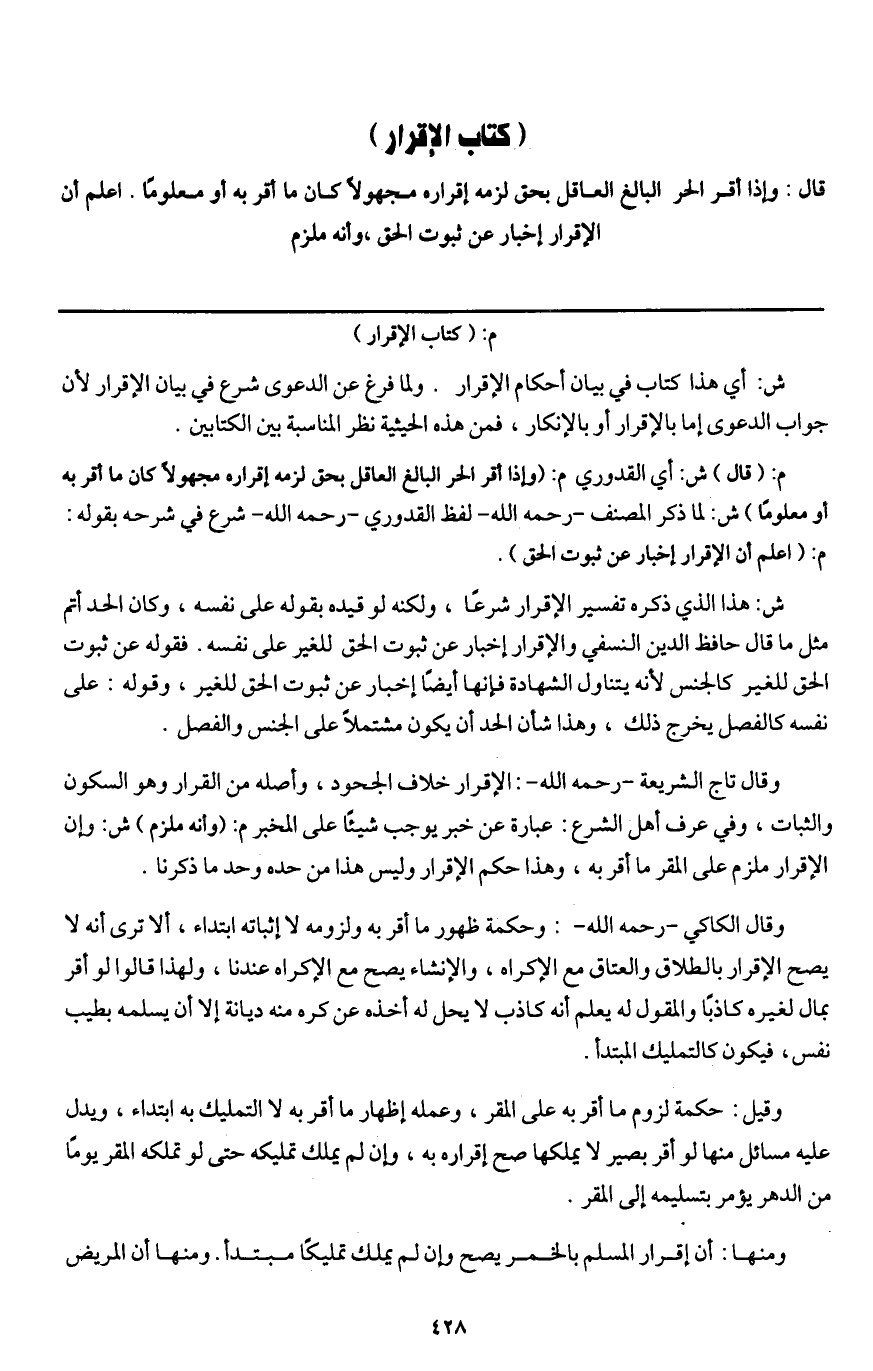 (كتاب الإقرار) قال: وإذا أقر الحر البالغ العاقل بحق لزمه إقراره مجهولا كان ما أقر به أو معلوما. اعلم أن الإقرار إخبار عن ثبوت الحق، وأنه ملزم