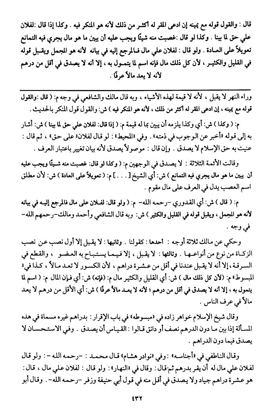 وحكي عن مالك ثلاثة أوجه: أحدها: كقولنا. وثانيها: لا يقبل إلا أول نصب عن نصب الزكاة من نوع من أنواعها. وثالثها: لا يقبل، إلا فيما يستباح به العضو، والقطع في السرقة، إلا أنه لا يقبل عندنا في أقل من عشرة دراهم، لأن الكسور لا تعد مالاً، كذا في " المبسوط " م: (لأن كل ذلك مال) ش: أي القليل والكثير مال م: (فإنه) ش: أي فإن المال م: (اسم لما يتمول به، إلا أنه لا يصدق في أقل من درهم؛ لأنه لا يعد مالاً عرفاً) ش: أي الأقل من درهم لا يعد مالاً في عرف الناس.