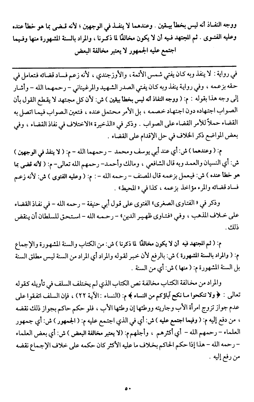 ووجه النفاذ أنه ليس بخطأ بيقين. وعندهما لا ينفذ في الوجهين؛ لأنه قضى بما هو خطأ عنده وعليه الفتوى. ثم المجتهد فيه أن لا يكون مخالفا لما ذكرنا، والمراد بالسنة المشهورة منها وفيما اجتمع عليه الجمهور لا يعتبر مخالفة البعض