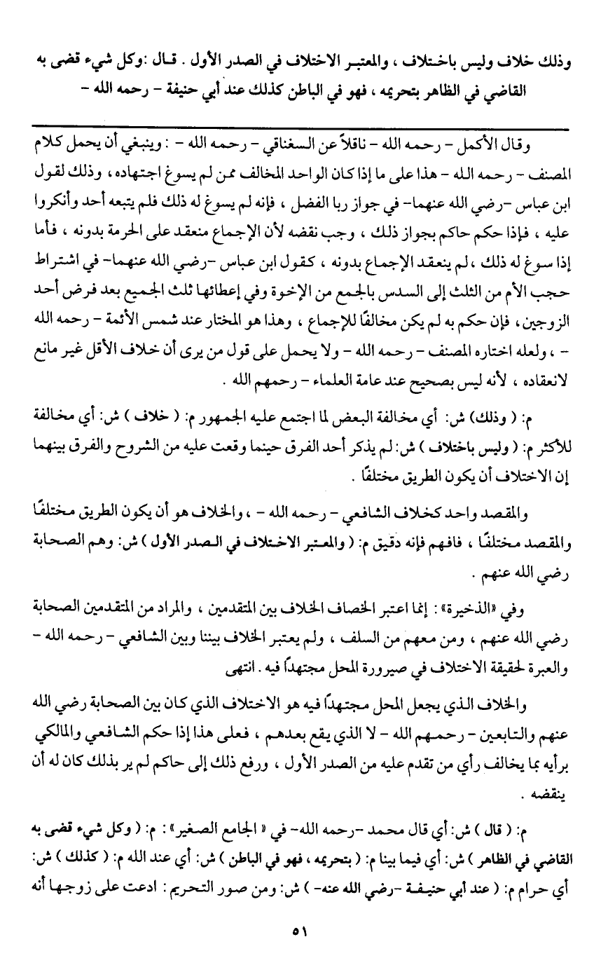 ـــــــــــــــــــــــــــــQوقال الأكمل - رَحِمَهُ اللَّهُ - ناقلا عن السغناقي - رَحِمَهُ اللَّهُ -: وينبغي أن يحمل كلام المصنف - رَحِمَهُ اللَّهُ - هذا على ما إذا كان الواحد المخالف ممن لم يسوغ اجتهاده، وذلك لقول ابن عباس - رَضِيَ اللَّهُ عَنْهُمَا - في جواز ربا الفضل، فإنه لم يسوغ له ذلك فلم يتبعه أحد وأنكروا عليه، فإذا حكم حاكم بجواز ذلك، وجب نقضه لأن الإجماع منعقد على الحرمة بدونه، فأما إذا سوغ له ذلك، لم ينعقد الإجماع بدونه، كقول ابن عباس - رَضِيَ اللَّهُ عَنْهُمَا - في اشتراط حجب الأم من الثلث إلى السدس بالجمع من الإخوة وفي إعطائها ثلث الجميع بعد فرض أحد الزوجين، فإن حكم به لم يكن مخالفا للإجماع، وهذا هو المختار عند شمس الأئمة - رَحِمَهُ اللَّهُ -، ولعله اختاره المصنف - رَحِمَهُ اللَّهُ - ولا يحمل على قول من يرى أن خلاف الأقل غير مانع لانعقاده، لأنه ليس بصحيح عند عامة العلماء - رَحِمَهُمُ اللَّهُ -.