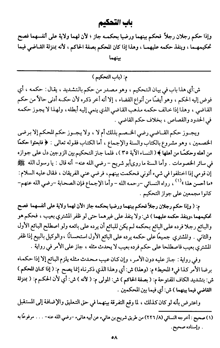 ويجوز حكم القاضي رضي الخصم بذلك أم لا، ولا يجوز حكم المحكم إلا برضى الخصمين، وهو مشروع بالكتاب والسنة والإجماع، أما الكتاب فقوله تعالى: {فَابْعَثُوا حَكَمًا مِنْ أَهْلِهِ وَحَكَمًا مِنْ أَهْلِهَا} [النساء: 35] (النساء الآية 35) ، فلما جاز التحكيم بين الزوجين دل على جوازه في سائر الخصومات. وأما السنة ما «روى أبو شريح - رَضِيَ اللَّهُ عَنْهُ - أنه قال: يا رسول الله - صَلَّى اللَّهُ عَلَيْهِ وَسَلَّمَ - إن قومي إذا اختلفوا في شيء أتوني فحكمت بينهم، فرضي عني الفريقان، فقال - عَلَيْهِ السَّلَامُ -: " ما أحسن هذا» ، رواه النسائي - رَحِمَهُ اللَّهُ - وأما الإجماع فإن الصحابة - رَضِيَ اللَّهُ عَنْهُمْ - كانوا مجمعين على جواز التحكيم.