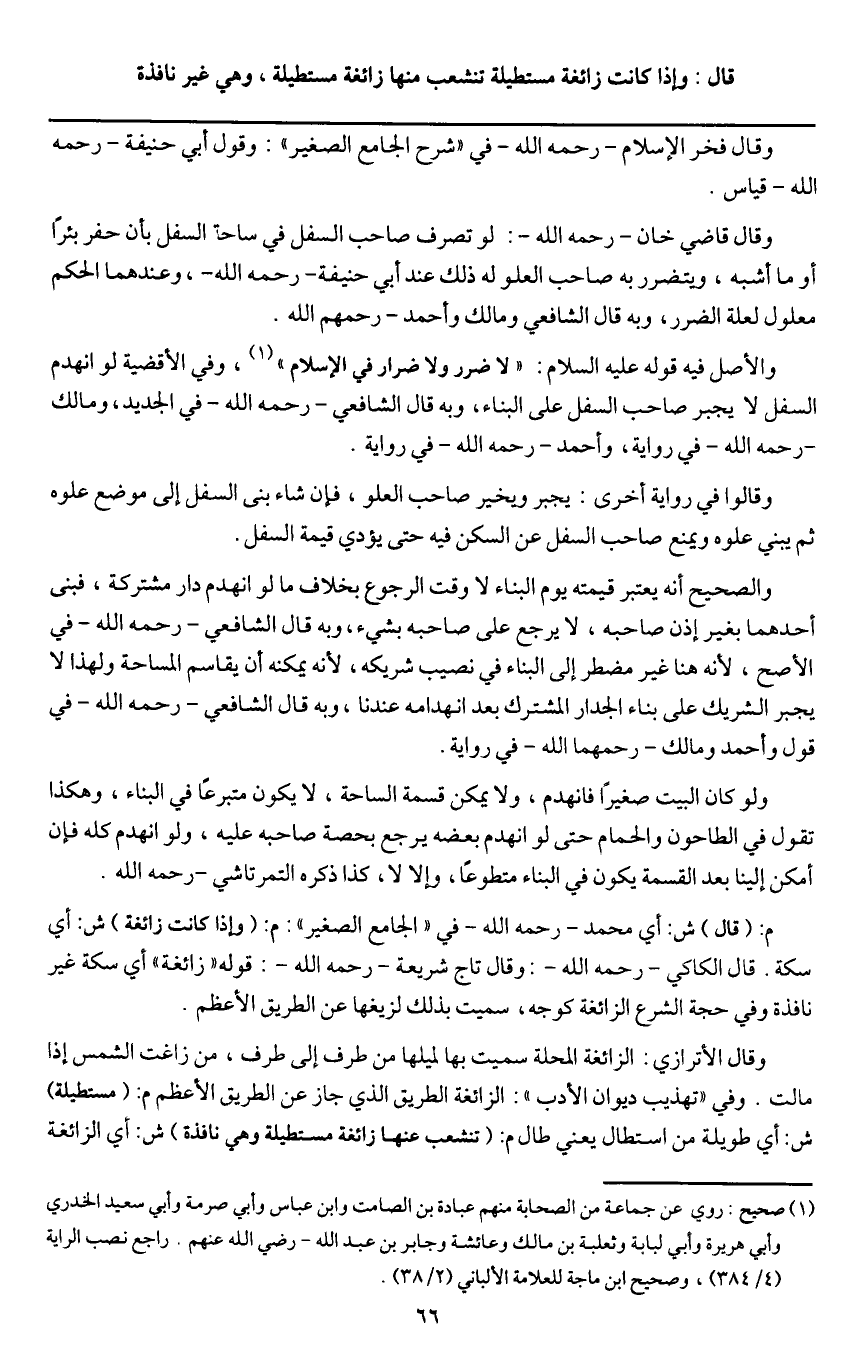 والأصل فيه قوله - عَلَيْهِ السَّلَامُ -: «لا ضرر ولا ضرار في الإسلام» ، وفي الأقضية لو انهدم السفل لا يجبر صاحب السفل على البناء، وبه قال الشافعي - رَحِمَهُ اللَّهُ - في الجديد، ومالك - رَحِمَهُ اللَّهُ - في رواية، وأحمد - رَحِمَهُ اللَّهُ - في رواية.