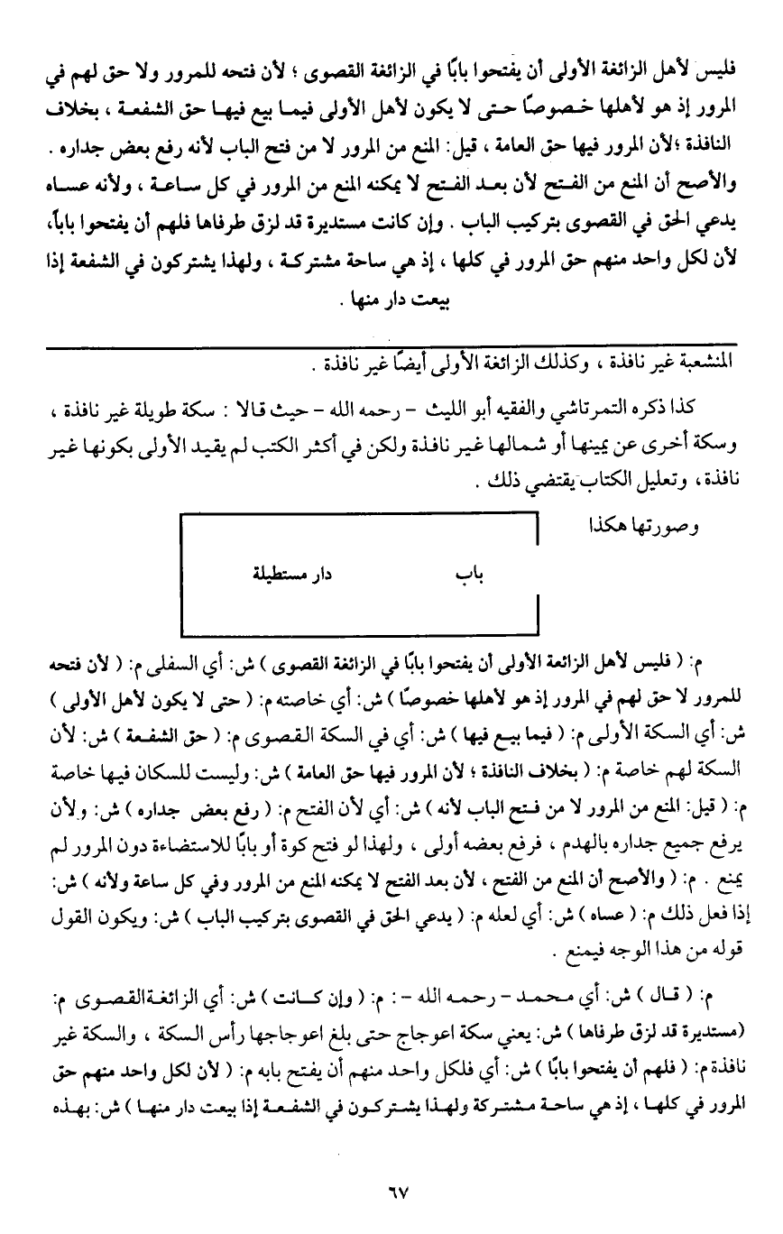 م: (فليس لأهل الزائغة الأولى أن يفتحوا بابا في الزائغة القصوى) ش: أي السفلى م: (لأن فتحه للمرور لاحق لهم في المرور إذ هو لأهلها خصوصا) ش: أي خاصته م: (حتى لا يكون لأهل الأولى) ش: أي السكة الأولى م: (فيما بيع فيها) ش: أي في السكة القصوى م: (حق الشفعة) ش: لأن السكة لهم خاصة م: (بخلاف النافذة؛ لأن المرور فيها حق العامة) ش: وليست للسكان فيها خاصة م: (قيل: المنع من المرور لا من فتح الباب لأنه) ش: أي لأن الفتح م: (رفع بعض جداره) ش: ولأن يرفع جميع جداره بالهدم، فرفع بعضه أولى، ولهذا لو فتح كوة أو بابا للاستضاءة دون المرور لم يمنع. م: (والأصح أن المنع من الفتح، لأن بعد الفتح لا يمكنه المنع من المرور وفي كل ساعة ولأنه) ش: إذا فعل ذلك م: (عساه) ش: أي لعله م: (يدعي الحق في القصوى بتركيب الباب) ش: ويكون القول قوله من هذا الوجه فيمنع.