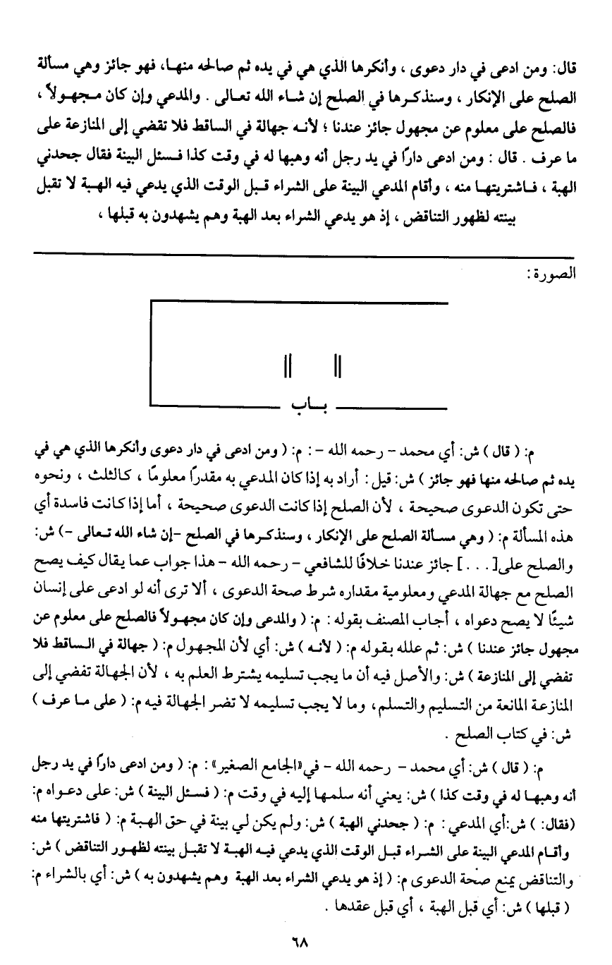 م: (قال) ش: أي محمد - رَحِمَهُ اللَّهُ -: م: (ومن ادعى في دار دعوى وأنكرها الذي هي في يده ثم صالحه منها فهو جائز) ش: قيل: أراد به إذا كان المدعي به مقدرا معلوما، كالثلث، ونحوه حتى تكون الدعوى صحيحة؛ لأن الصلح إذا كانت الدعوى صحيحة، أما إذا كانت فاسدة أي هذه المسألة م: (وهي مسألة الصلح على الإنكار، وسنذكرها في الصلح - إن شاء الله تعالى -) ش: والصلح على [ ... ] جائز عندنا خلافا للشافعي - رَحِمَهُ اللَّهُ - هذا جواب عما يقال كيف يصح الصلح مع جهالة المدعي ومعلومية مقداره شرط صحة الدعوى، ألا ترى أنه لو ادعى على إنسان شيئا لا يصح دعواه، أجاب المنصف بقوله: م: (والمدعى وإن كان مجهولا فالصلح على معلوم عن مجهول جائز عندنا) ش: ثم علله بقوله م: (لأنه) ش: أي لأن المجهول م: (جهالة في الساقط فلا تفضي إلى المنازعة) ش: والأصل فيه أن ما يجب تسليمه يشترط العلم به، لأن الجهالة تفضي إلى المنازعة المانعة من التسليم والتسلم، وما لا يجب تسليمه لا تضر الجهالة فيه م: (على ما عرف) ش: في كتاب الصلح.