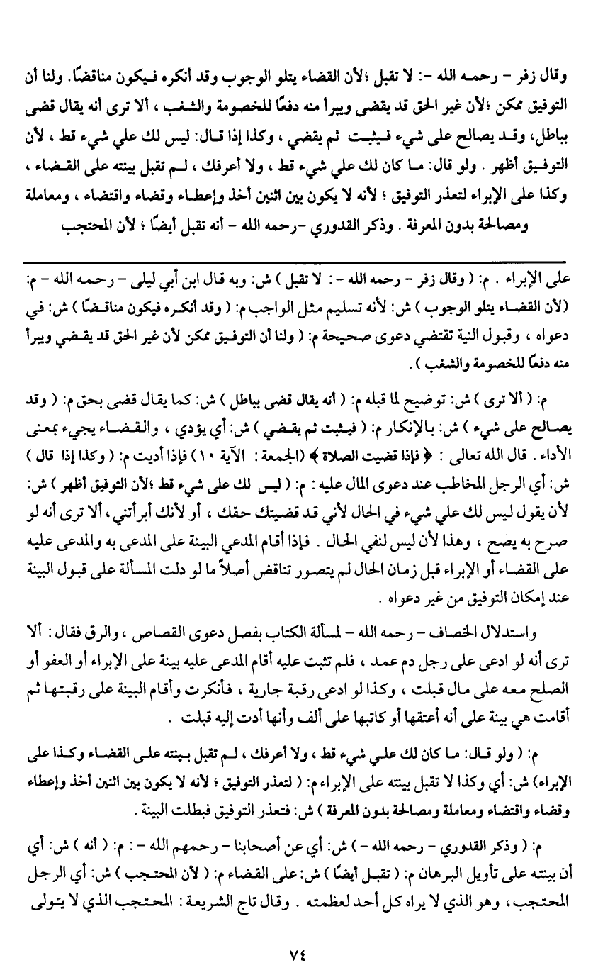 ـــــــــــــــــــــــــــــQعلى الإبراء. م: (وقال زفر - رَحِمَهُ اللَّهُ -: لا تقبل) ش: وبه قال ابن أبي ليلى - رَحِمَهُ اللَّهُ - م: (لأن القضاء يتلو الوجوب) ش: لأنه تسليم مثل الواجب م: (وقد أنكره فيكون مناقضا) ش: في دعواه، وقبول النية تقتضي دعوى صحيحة م: (ولنا أن التوفيق ممكن لأن غير الحق قد يقضي ويبرأ منه دفعا للخصومة والشغب) .