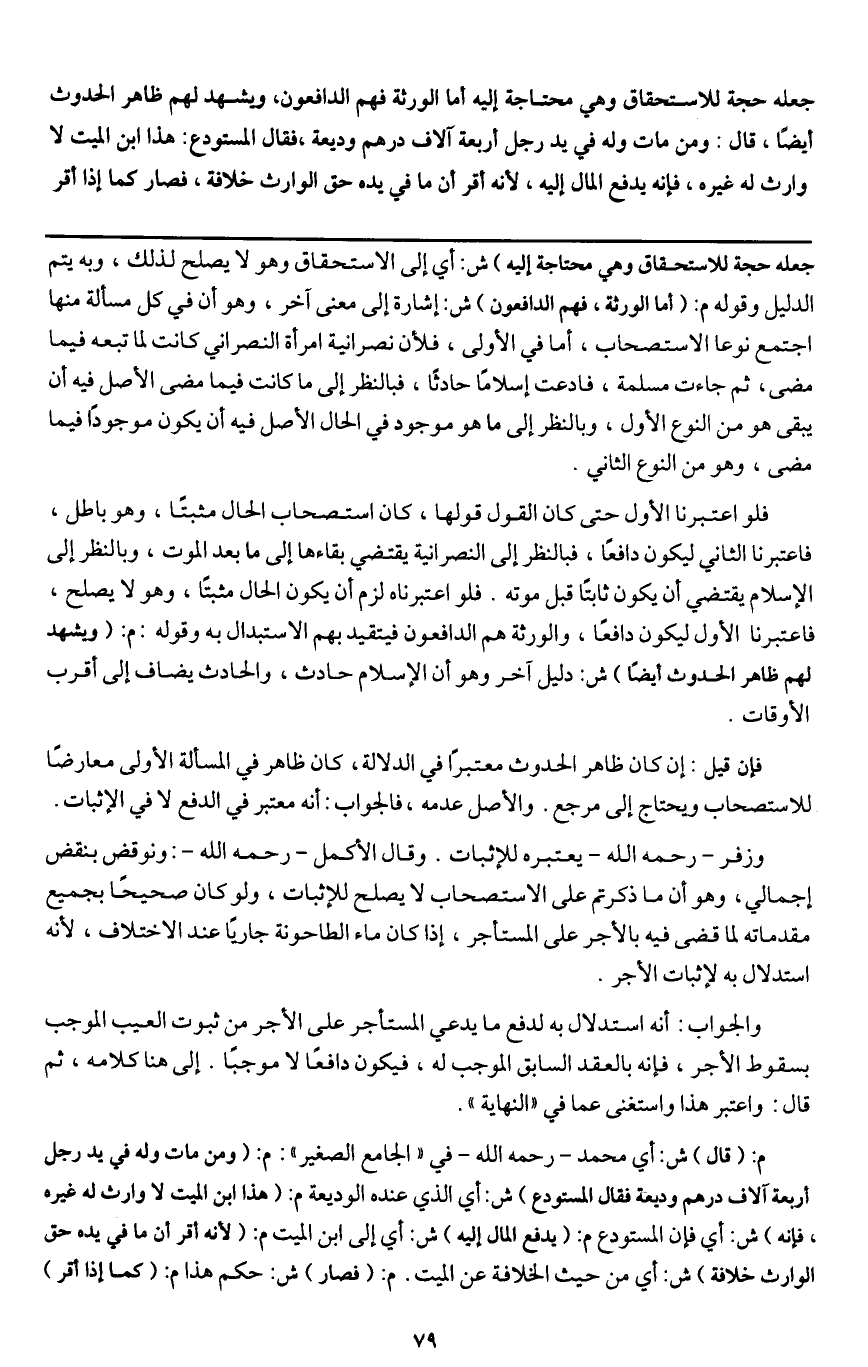 ـــــــــــــــــــــــــــــQجعله حجة للاستحقاق وهي محتاجة إليه) ش: أي إلى الاستحقاق وهو لا يصلح لذلك، وبه يتم الدليل وقوله م: (أما الورثة، فهم الدافعون) ش: إشارة إلى معنى آخر، وهو أن في كل مسألة منها اجتمع نوعا الاستصحاب، أما في الأولى، فلأن نصرانية امرأة النصراني كانت لما تبعه فيما مضى، ثم جاءت مسلمة، فادعت إسلاما حادثا، فبالنظر إلى ما كانت فيما مضى الأصل فيه أن يبقى هو من النوع الأول، وبالنظر إلى ما هو موجود في الحال الأصل فيه أن يكون موجودا فيما مضى، وهو من النوع الثاني.