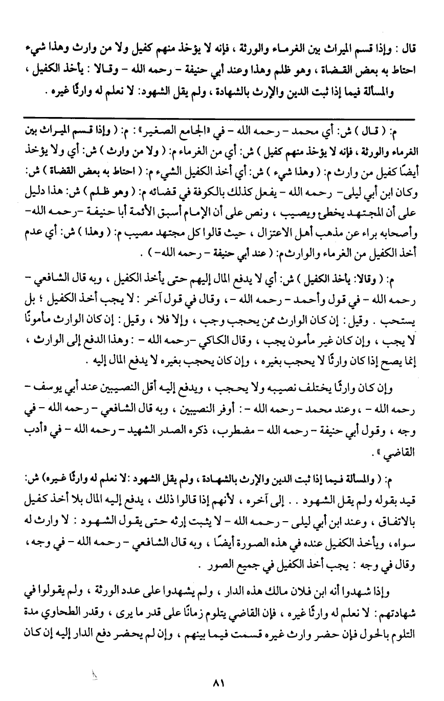 قال: وإذا قسم الميراث بين الغرماء والورثة، فإنه لا يؤخذ منهم كفيل ولا من وارث وهذا شيء احتاط به بعض القضاة، وهو ظلم وهذا وعند أبي حنيفة - رَحِمَهُ اللَّهُ - وقالا: يأخذ الكفيل، والمسألة فيما إذا ثبت الدين والإرث بالشهادة، ولم يقل الشهود: لا نعلم له وارثا غيره.