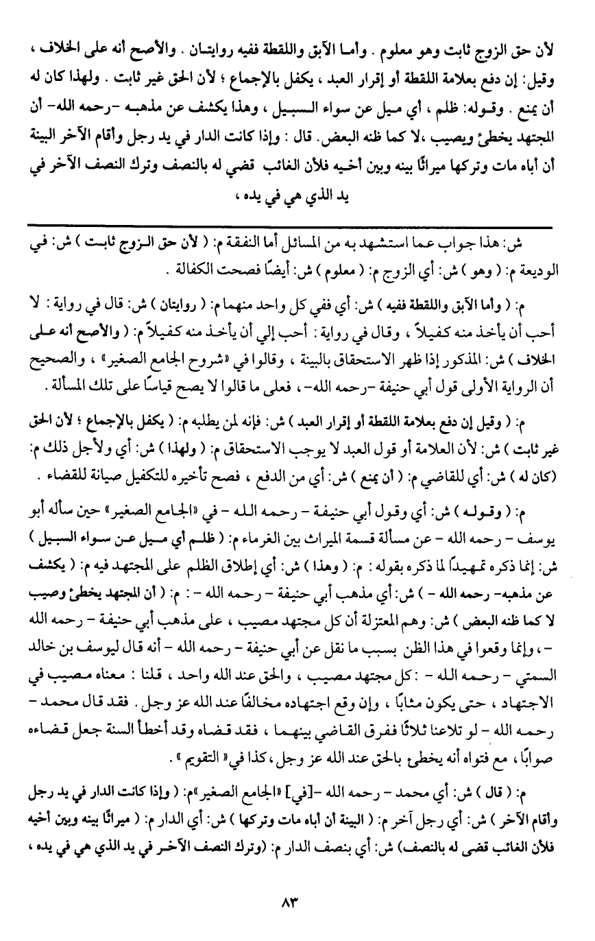 لأن حق الزوج ثابت وهو معلوم. وأما الآبق واللقطة ففيه روايتان. والأصح أنه على الخلاف، وقيل: إن دفع بعلامة اللقطة أو إقرار العبد، يكفل بالإجماع؛ لأن الحق غير ثابت. ولهذا كان له أن يمنع. وقوله: ظلم، أي ميل عن سواء السبيل، وهذا يكشف عن مذهبه - رَحِمَهُ اللَّهُ - أن المجتهد يخطئ ويصيب، لا كما ظنه البعض. قال: وإذا كانت الدار في يد رجل وأقام الآخر البينة أن أباه مات وتركها ميراثا بينه وبين أخيه فلأن الغائب قضي له بالنصف وترك النصف الآخر في يد الذي هي في يده،